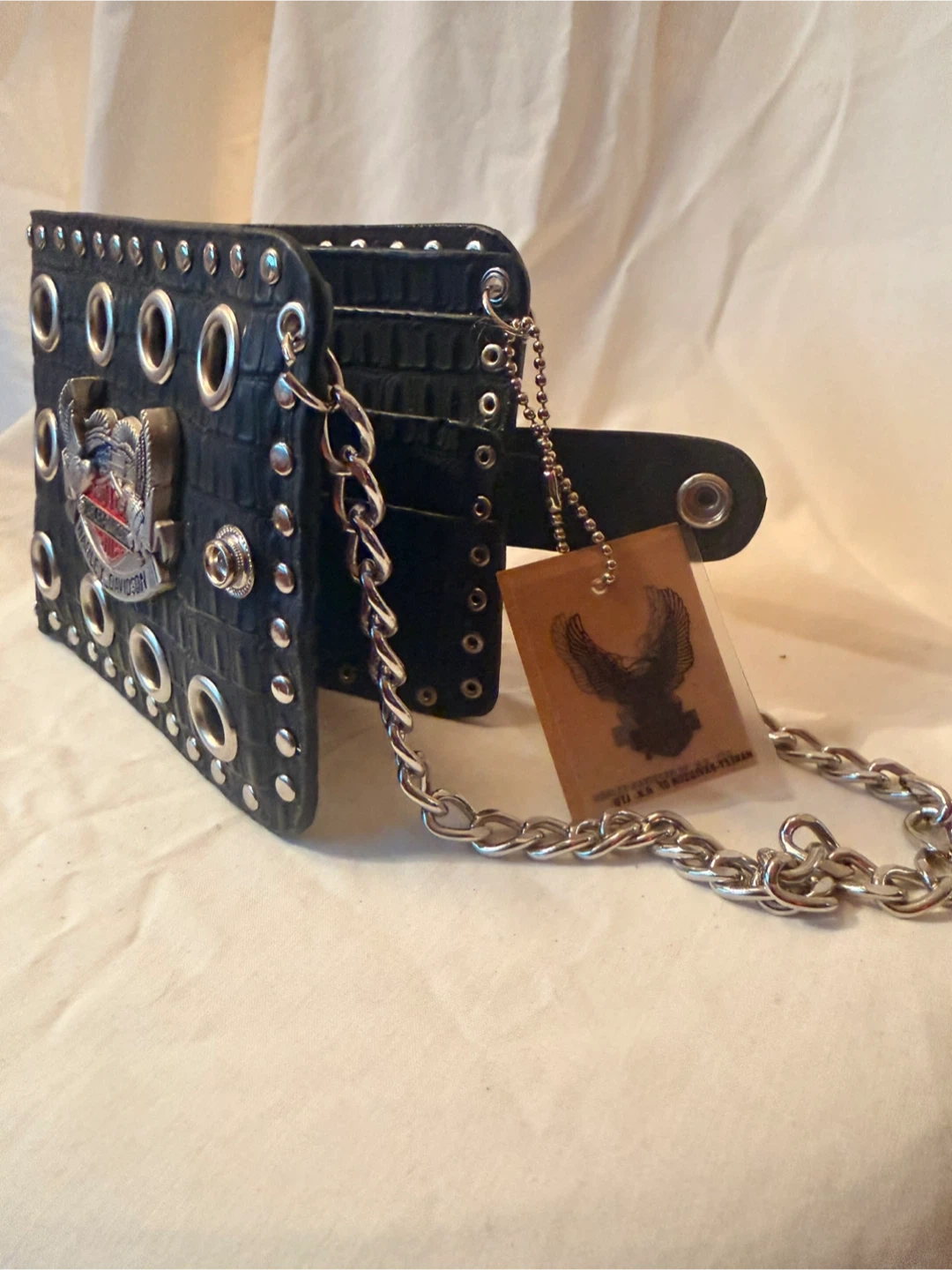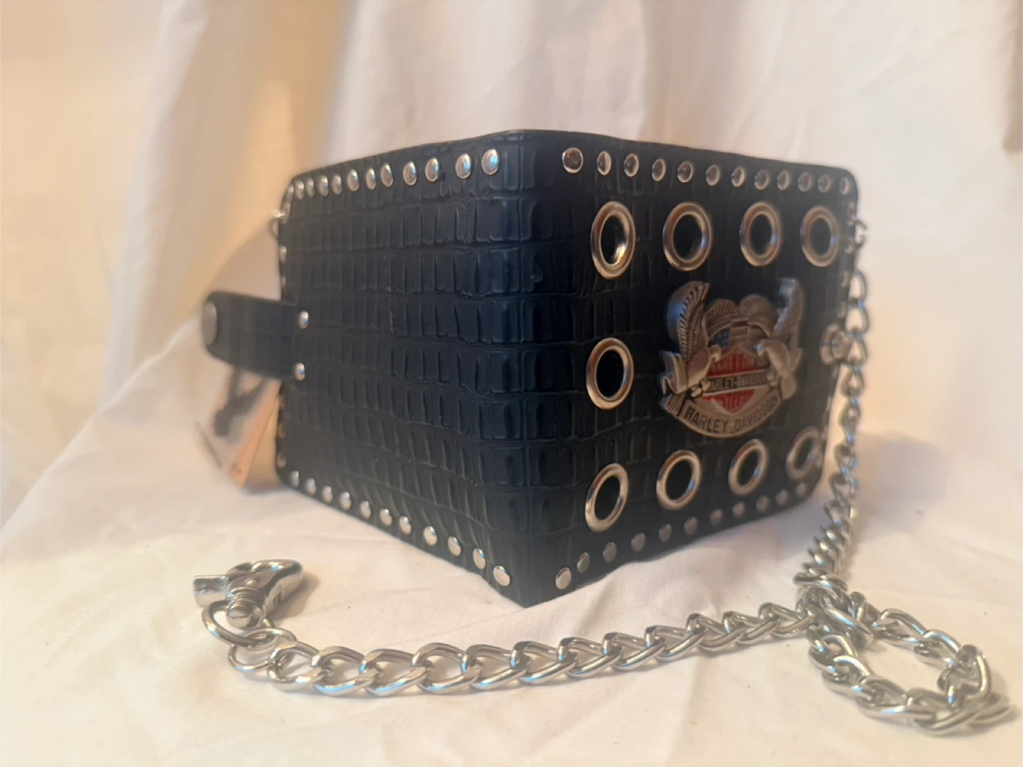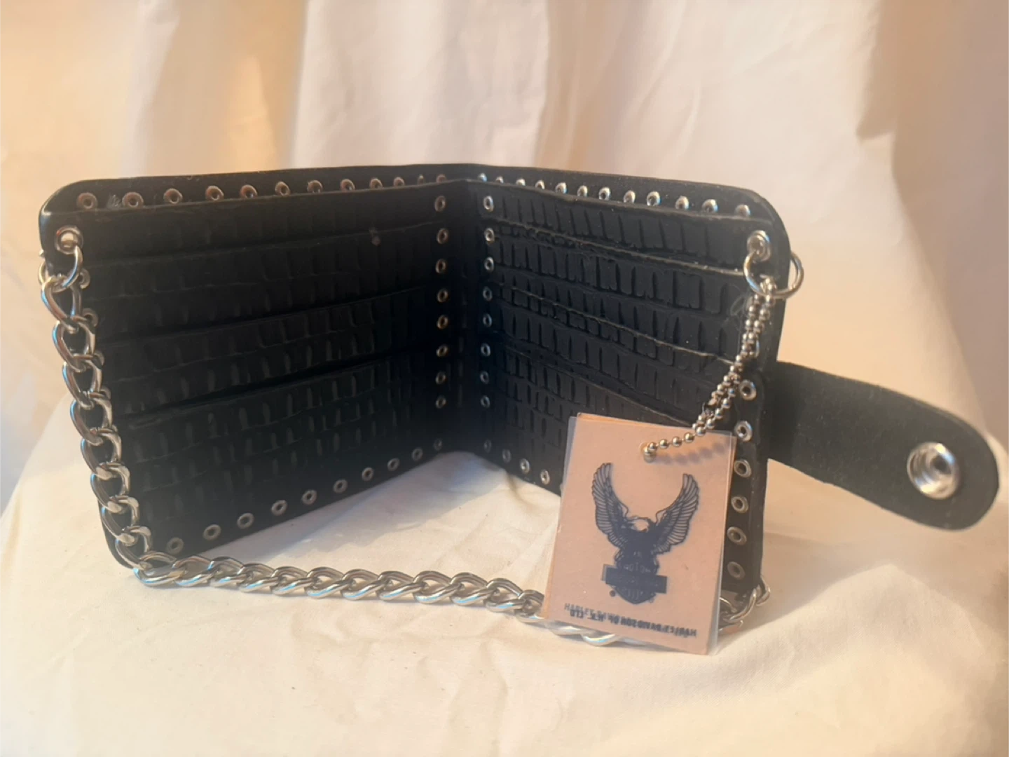 Selling a Harley Davidson black wallet. It features a silver chain and a snap closure. The wallet is in great condition and has a unique design with eyelets and studs.