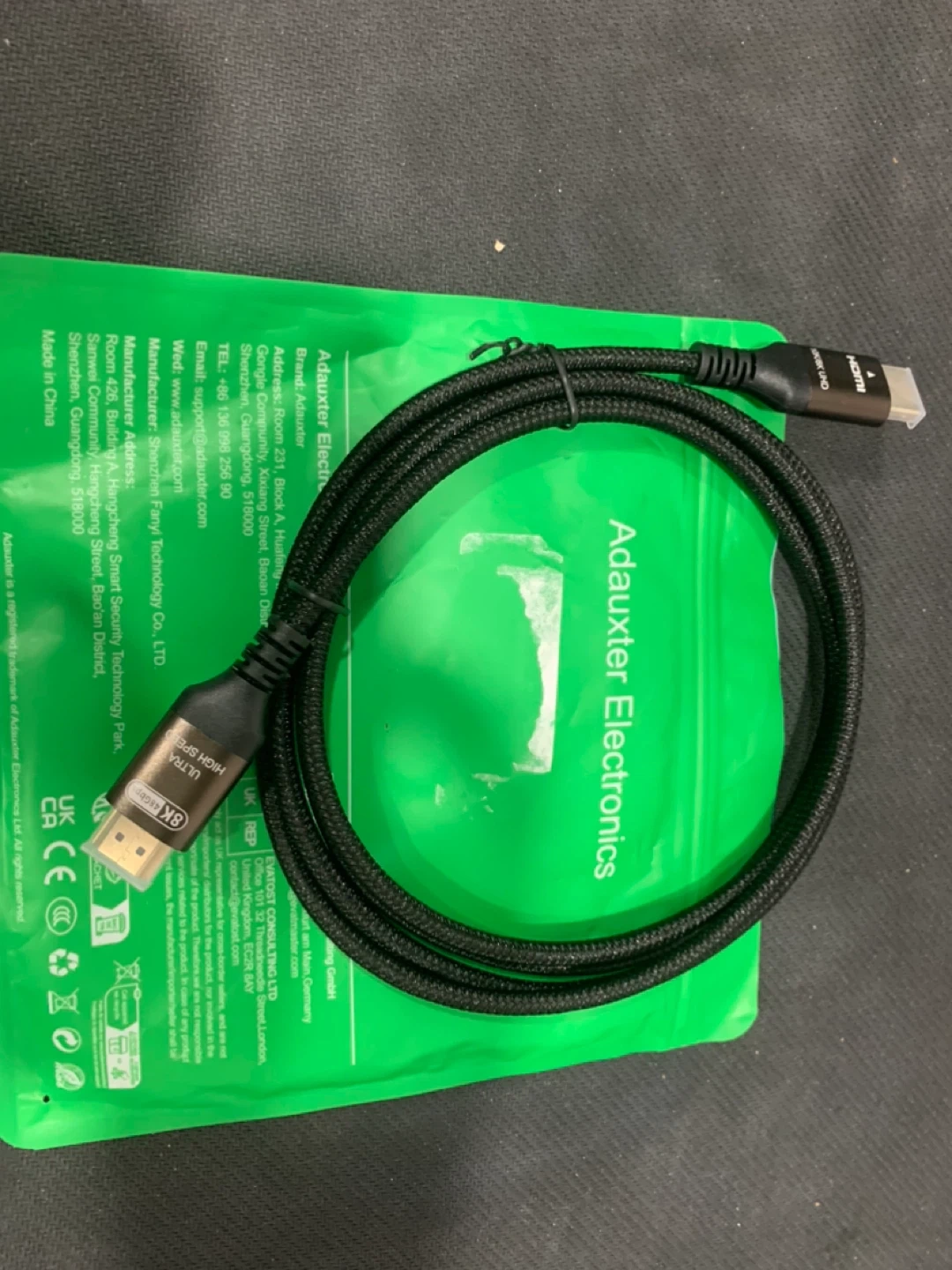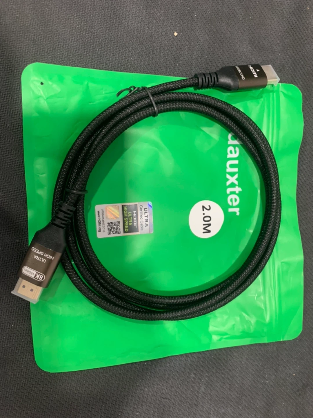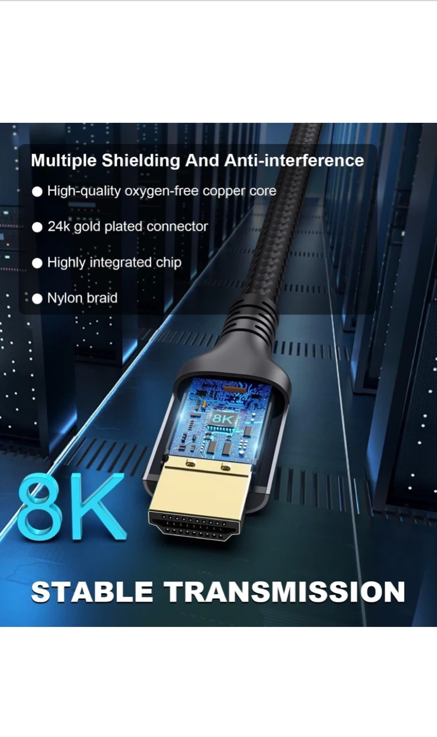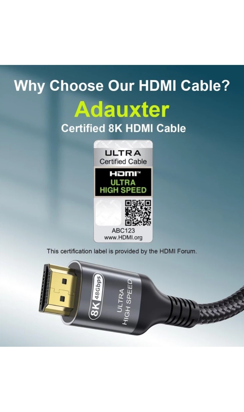 Selling an Adauxter Electronics HDMI cable. It's an 8K high-speed cable, perfect for high-quality audio and video. The cable is 2.0M long and features multiple shielding and anti-interference technology. It also has a 24k gold plated connector and a highly integrated chip, with a durable nylon braid.