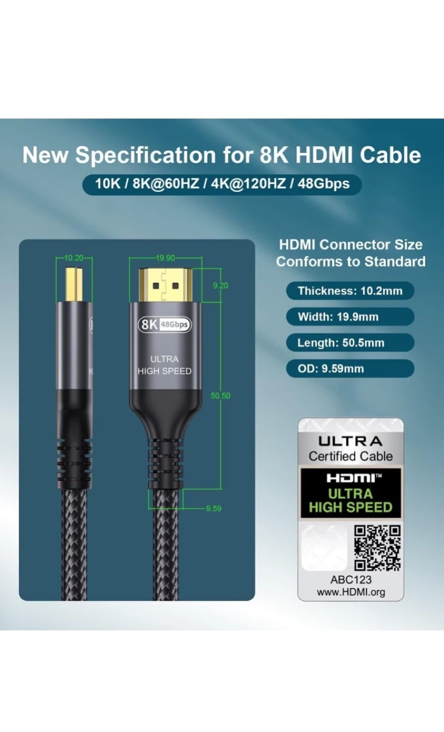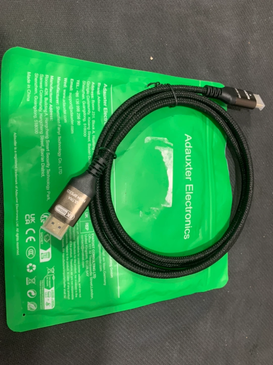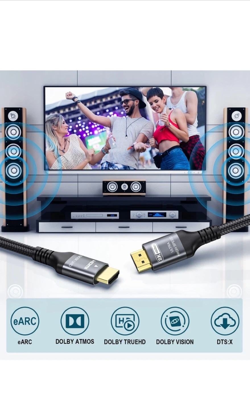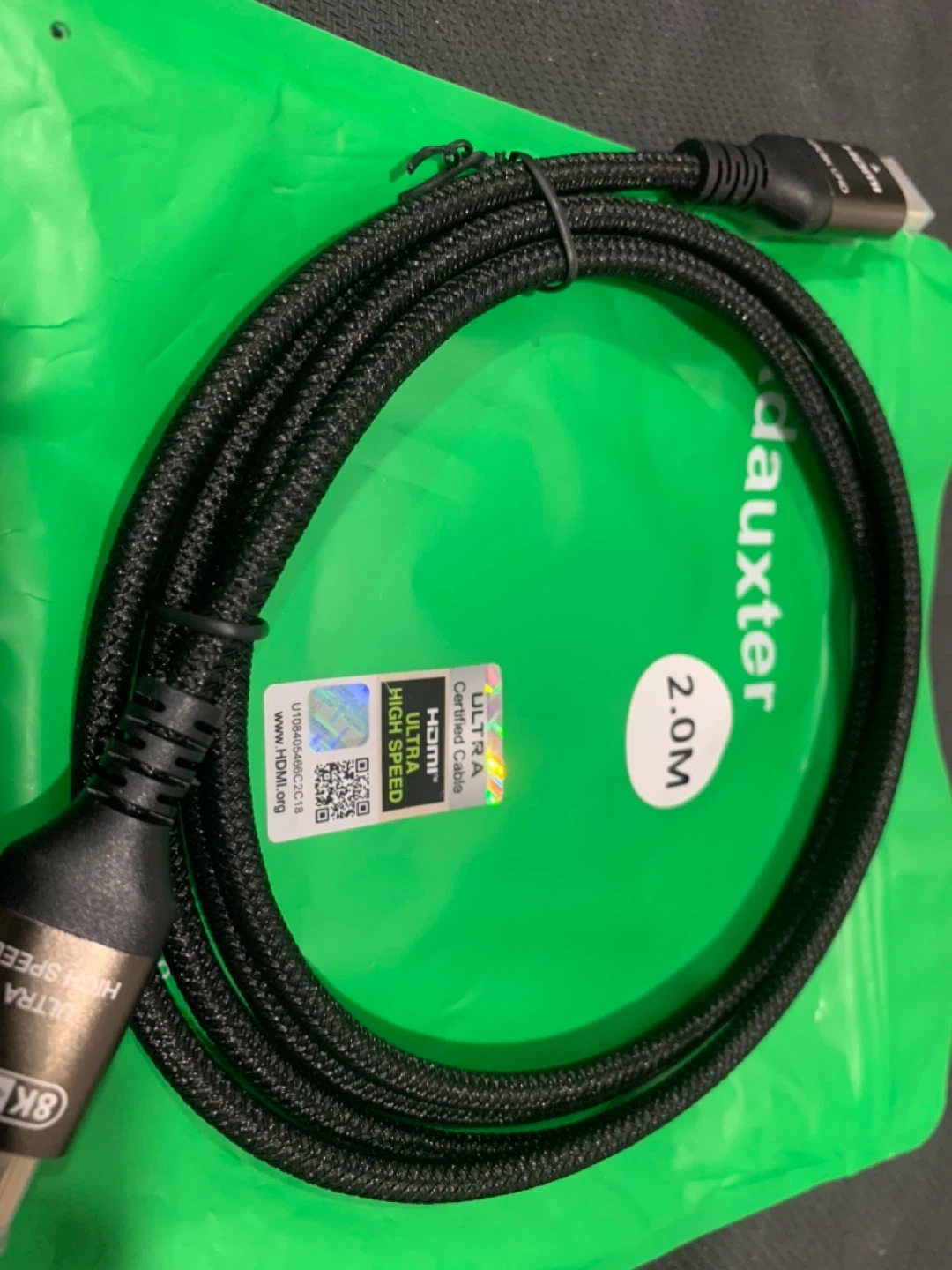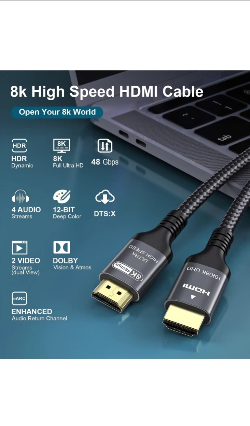 Selling an Adauxter Electronics HDMI cable. It's an 8K high-speed cable, perfect for high-quality audio and video. The cable is 2.0M long and features multiple shielding and anti-interference technology. It also has a 24k gold plated connector and a highly integrated chip, with a durable nylon braid.