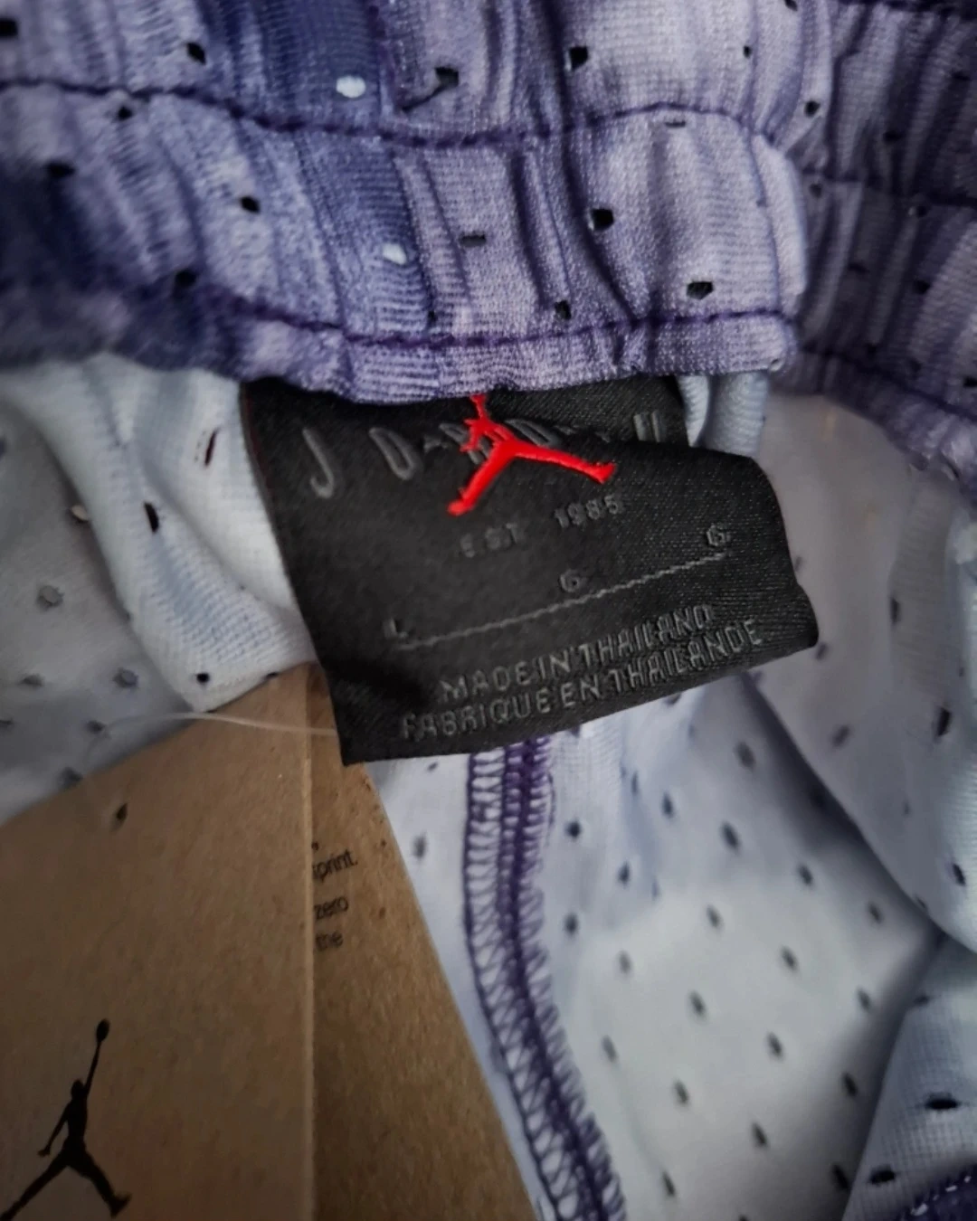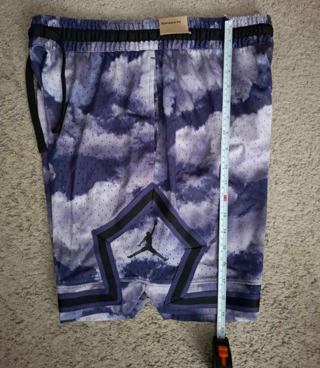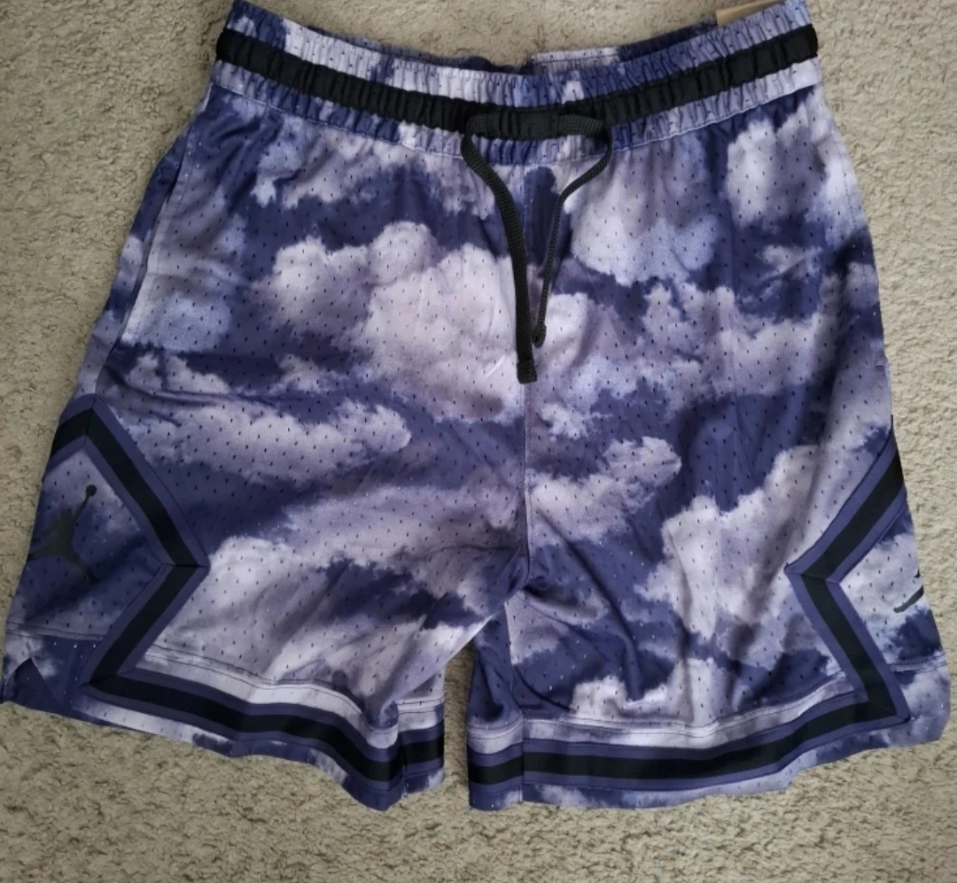 These Jordan shorts feature a cool cloud print design. They're a size large with a standard fit, perfect for casual wear or sports. The material is lightweight and breathable, great for staying comfortable. They have a Jordan logo on the front too!