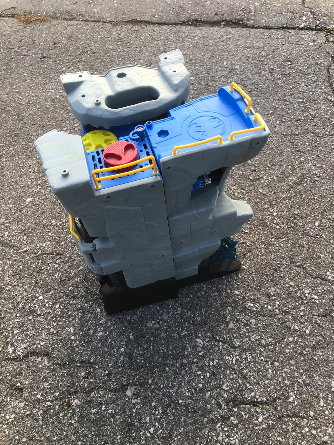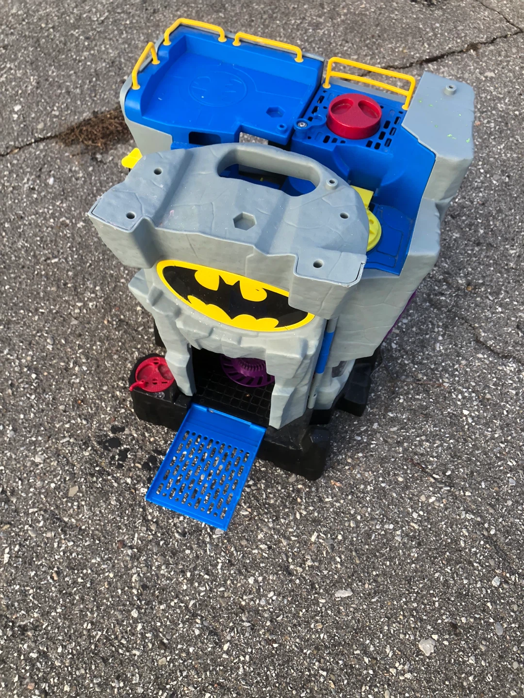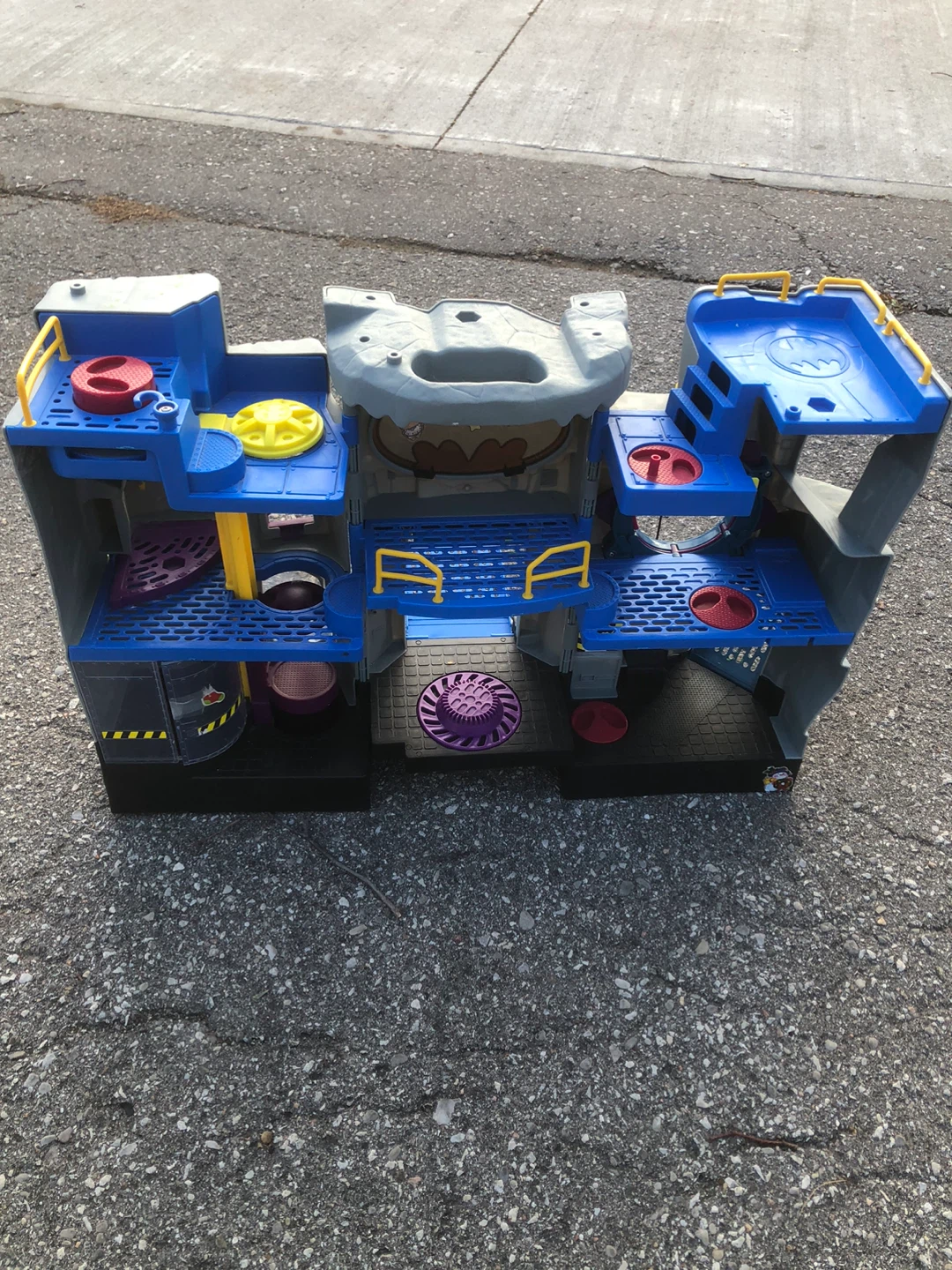 Selling a used Batman Batcave playset. It's in good condition and ready for a new superhero adventure! Features a grey stone-like exterior with blue and yellow accents