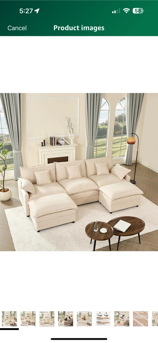 Selling a BIGSYY 108" U Shaped Couch, a modular sectional sofa with a movable ottoman. It's a 3-seater comfy cloud couch, perfect for deep seat lounging in the living room. The couch is made of linen and comes in beige.