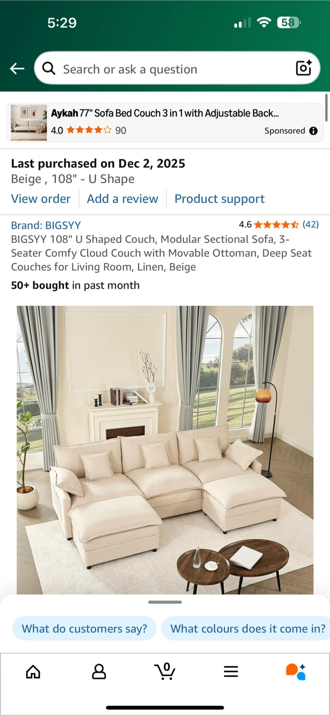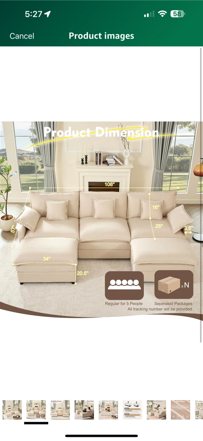 Selling a BIGSYY 108" U Shaped Couch, a modular sectional sofa with a movable ottoman. It's a 3-seater comfy cloud couch, perfect for deep seat lounging in the living room. The couch is made of linen and comes in beige.