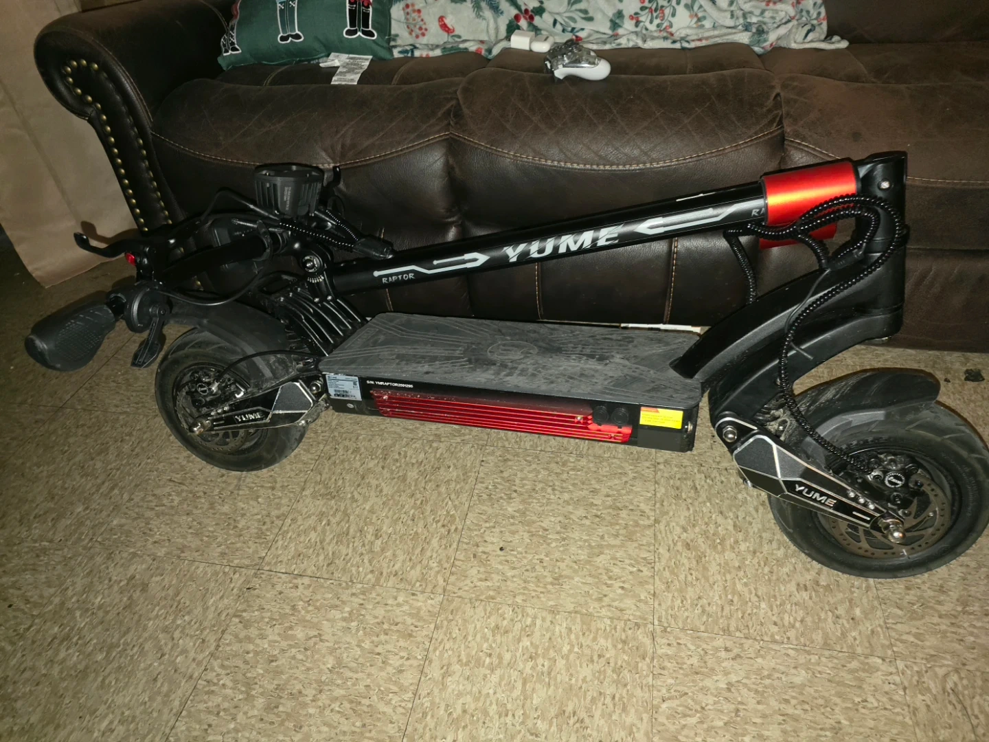 Selling a YUME Raptor electric scooter. It has a display screen that shows speed and trip distance. Comes with a charger. Great for getting around town! Top speed is 50 with dual suspension and throttle trigger