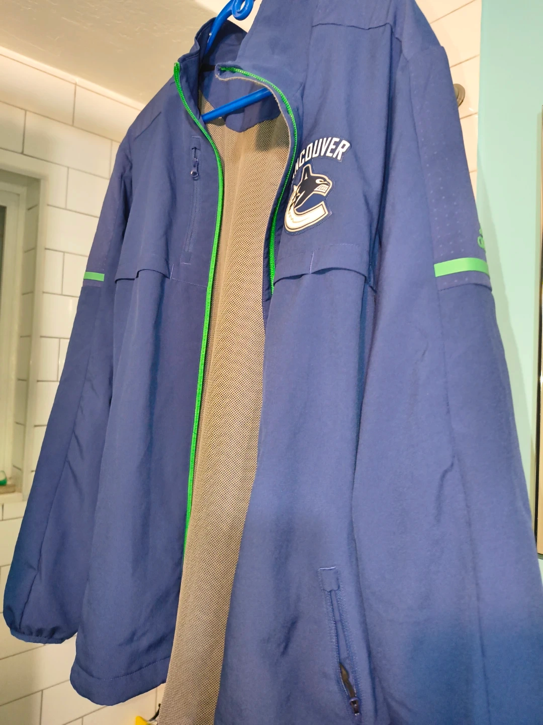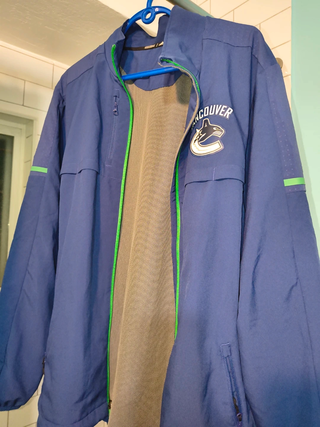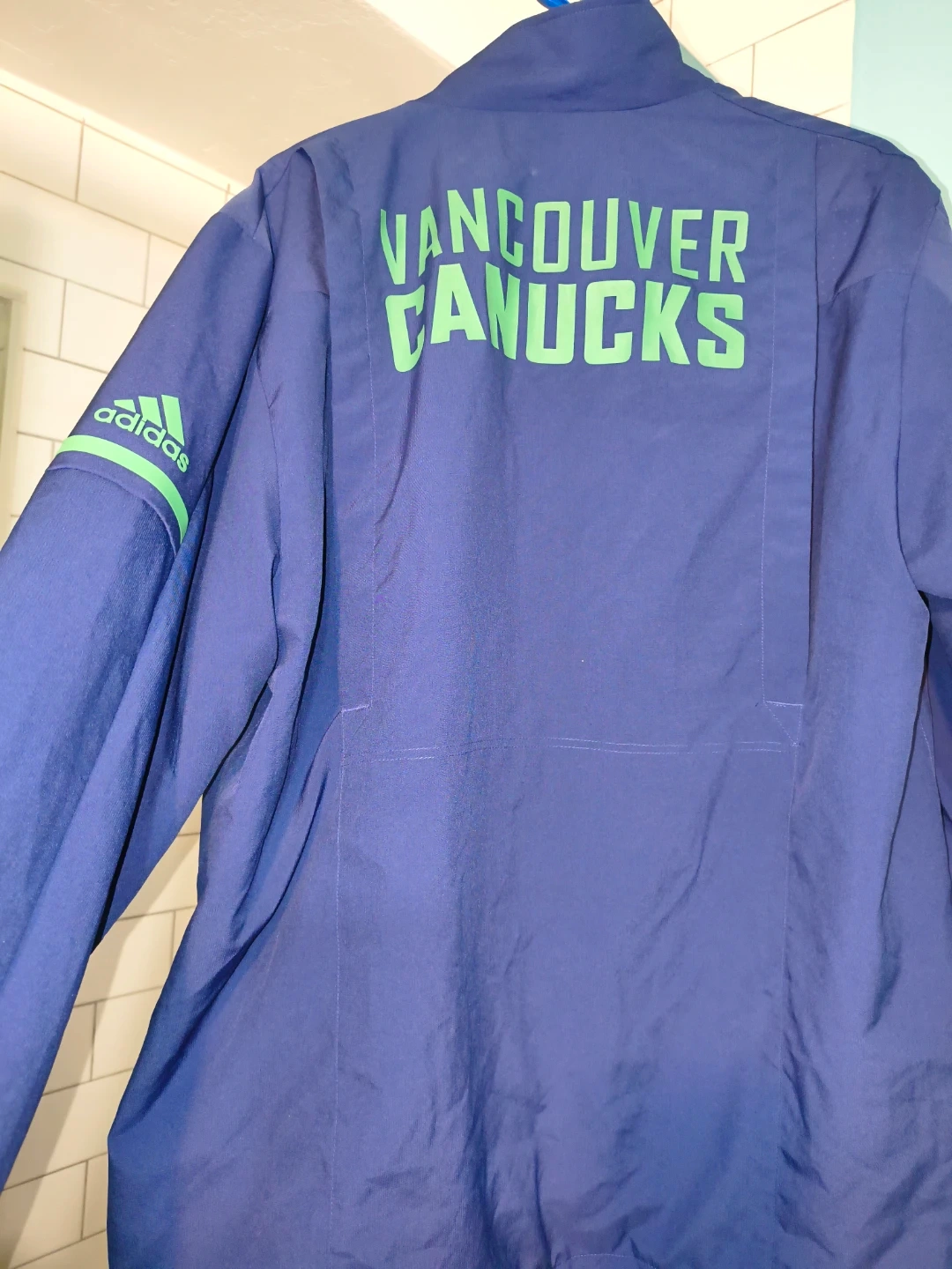 Selling an Adidas Vancouver Canucks jacket in size L. It's in great shape and features the Canucks logo on the front and back. Perfect for any Canucks fan!