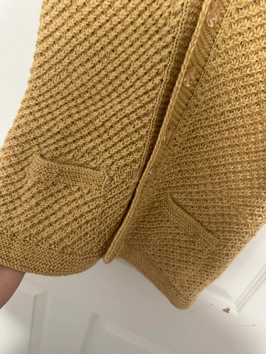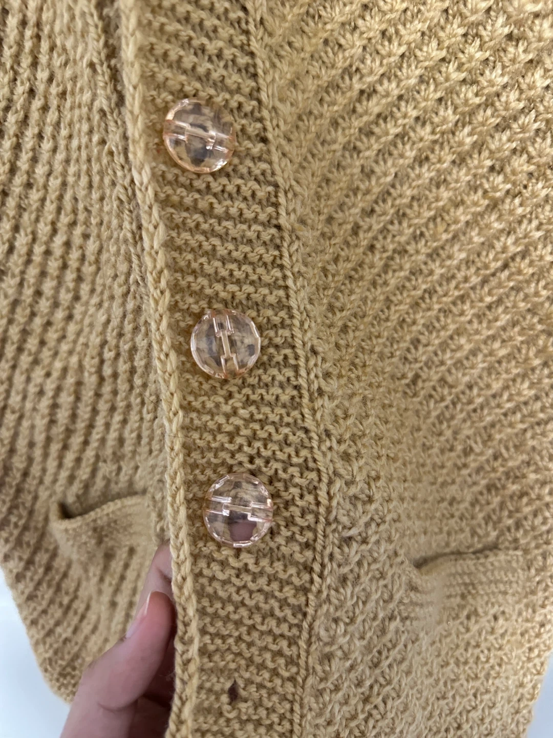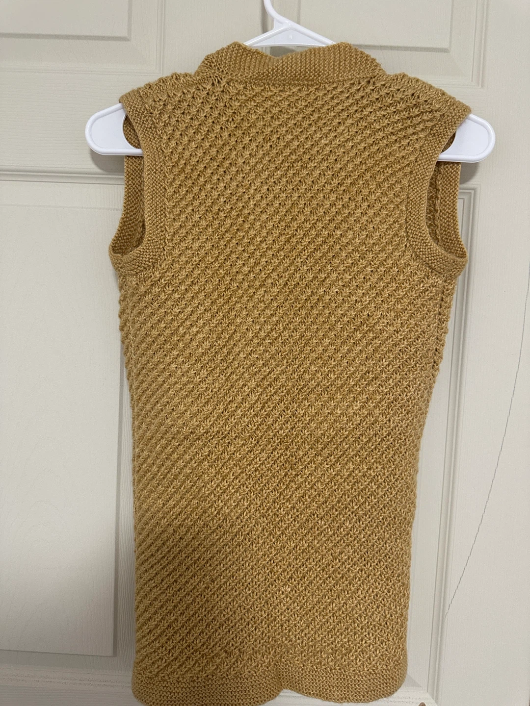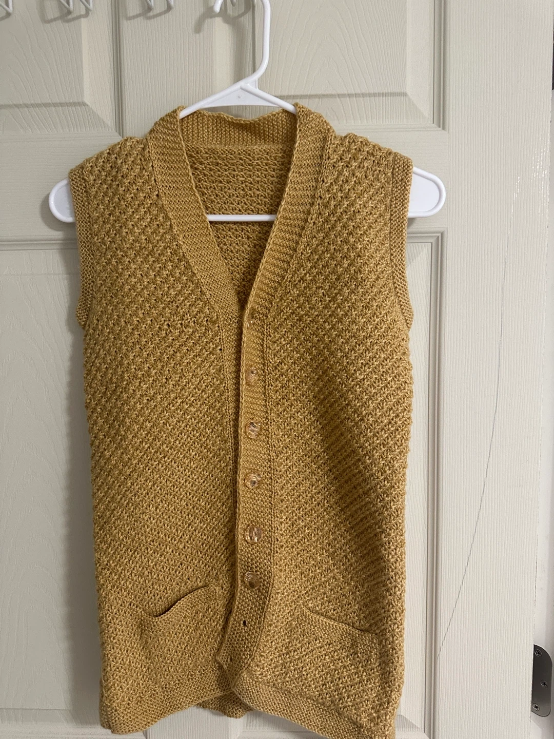 Here's a cozy knitted vest in a lovely mustard yellow colour! It features a V-neck and button-up design, complete with two small pockets. Perfect for layering during cooler weather!