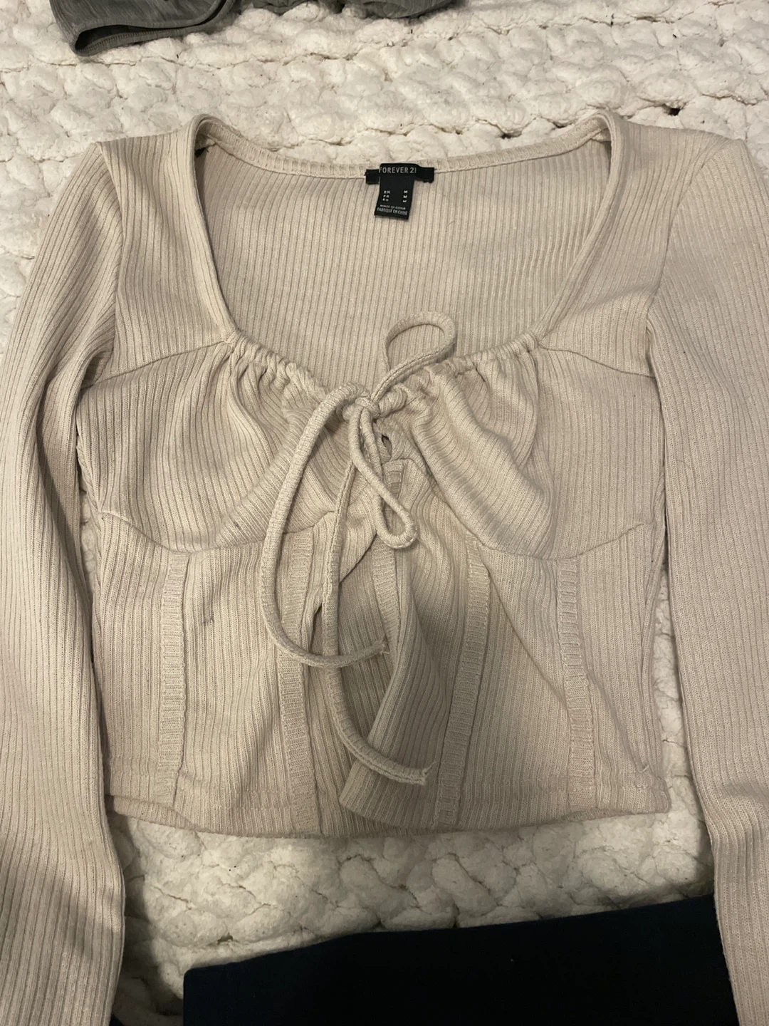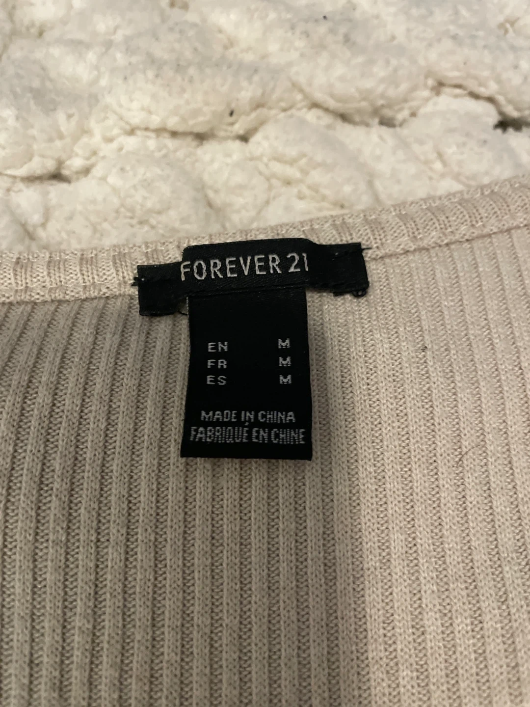 Selling a cute Forever 21 long sleeve top in size medium. It's a beige colour and in great condition. Perfect for layering or wearing on its own!