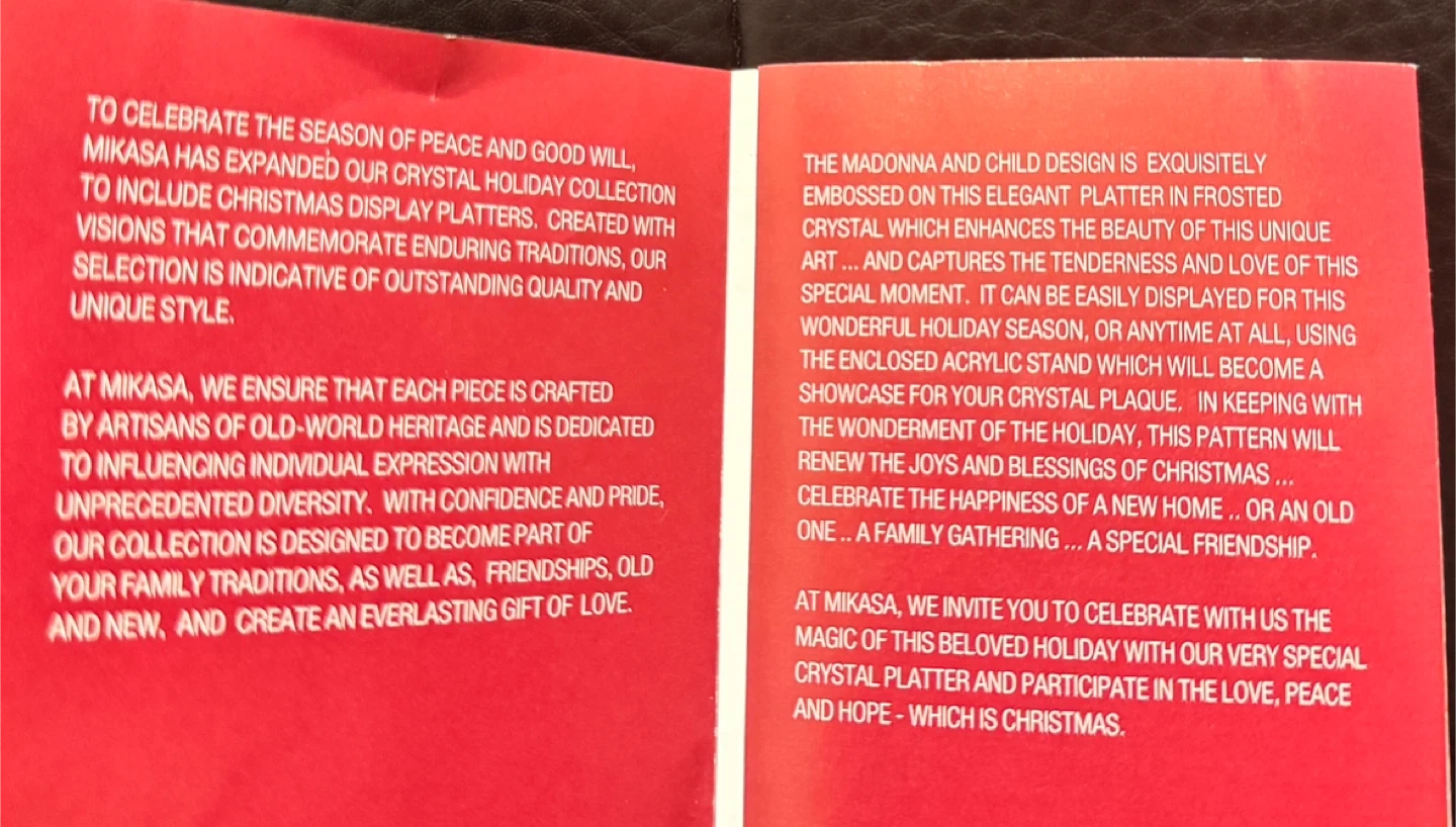 Selling a beautiful Mikasa crystal holiday platter featuring the Madonna and Child design. This elegant platter is embossed on frosted crystal, perfect for celebrating the season of peace and good will. It comes with its original box and is BRAND NEW!