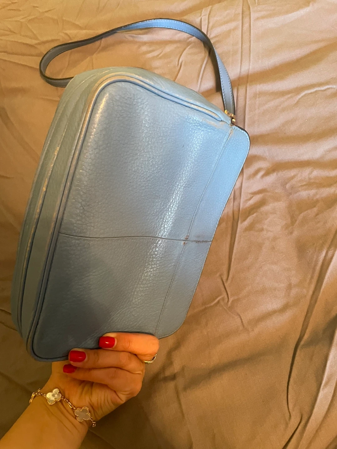 Selling a cute Tory Burch crossbody bag in a lovely blue color! It's made of leather and has the iconic Tory Burch logo. It's in good condition with some signs of wear.