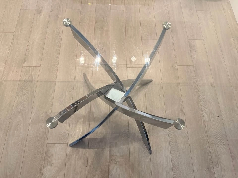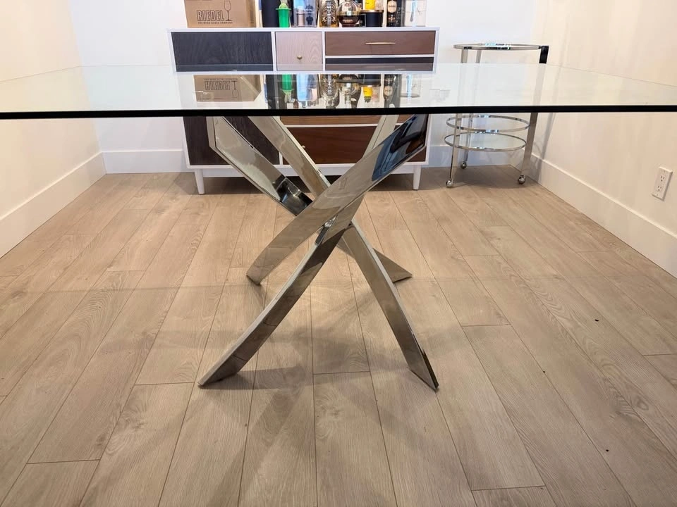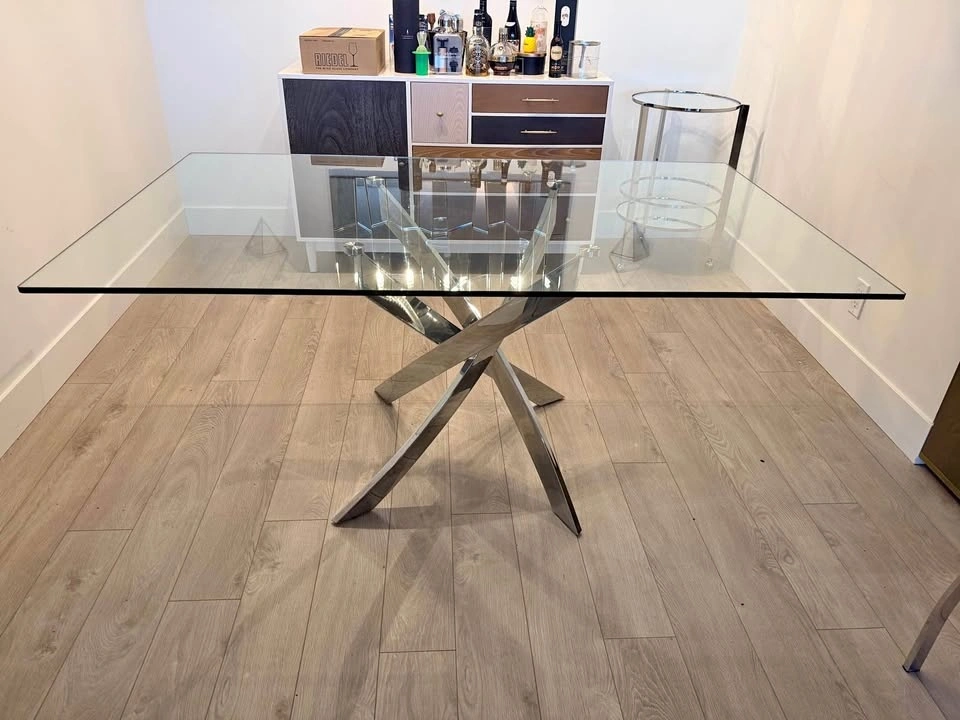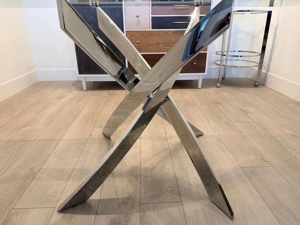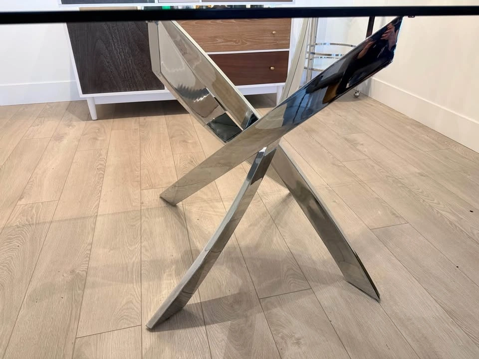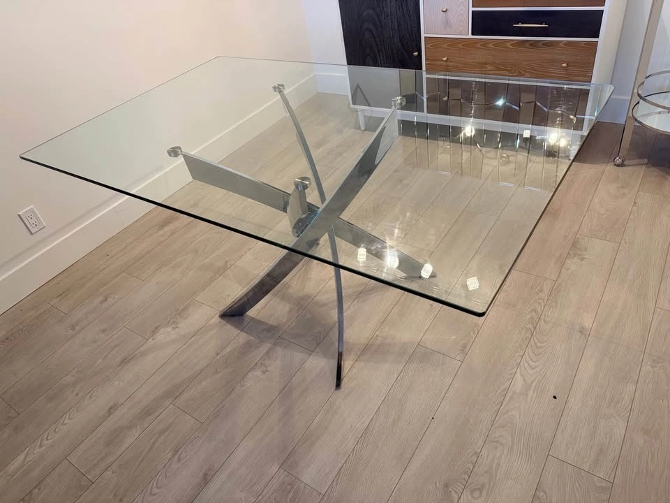 The table has a clear tempered glass top with a chrome / stainless steel base and a clean, contemporary look. There are no scratches, chips, or damage. It was very rarely used and mostly decorative.