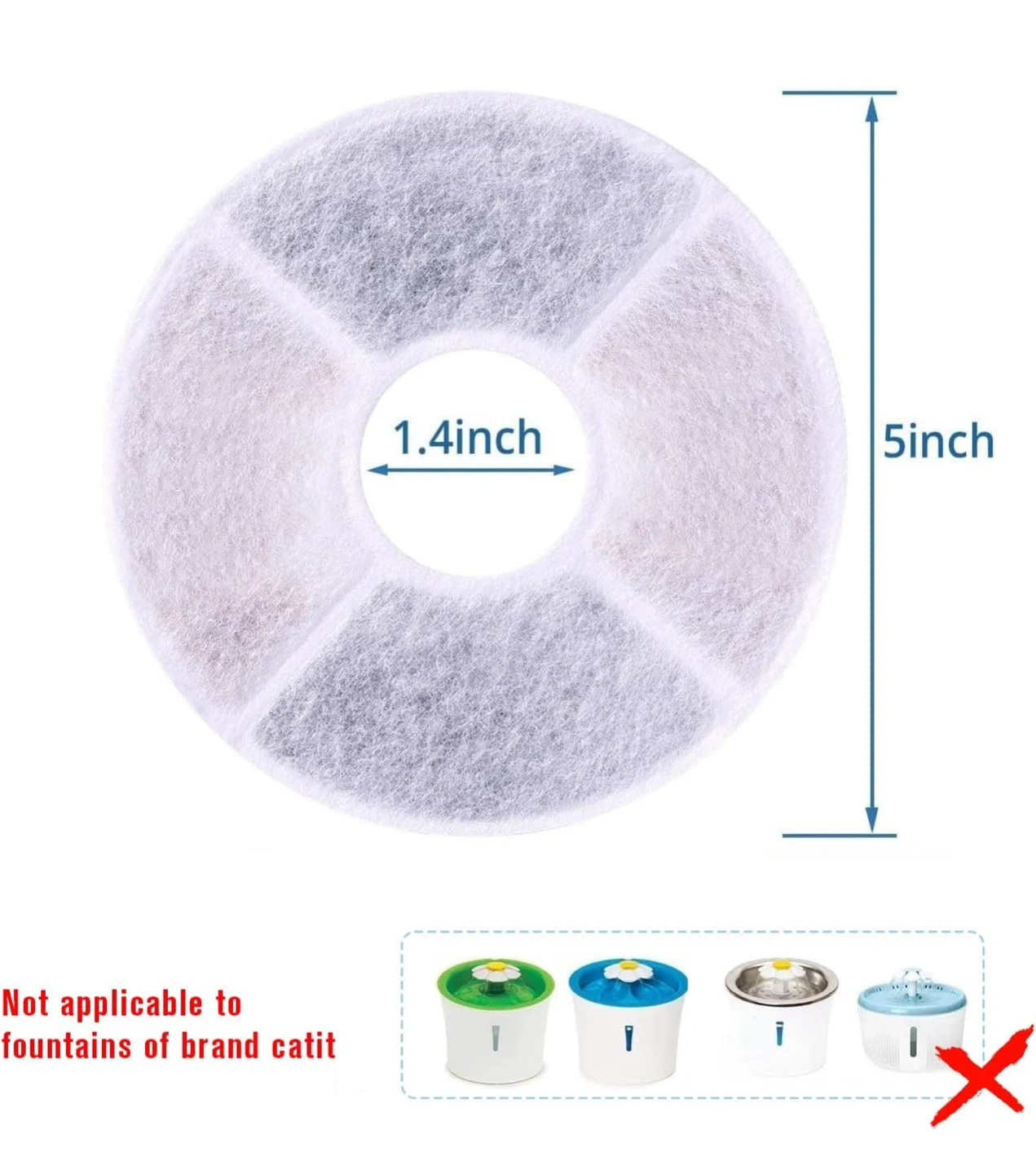Selling generic pet fountain filters, perfect for keeping your furry friend's water clean and fresh! These filters are 5 inches in diameter and feature a multi-layer filtration system. Please note that these are not applicable to Catit brand fountains. They are designed to fit most standard pet water fountains