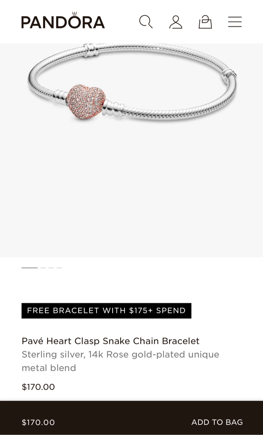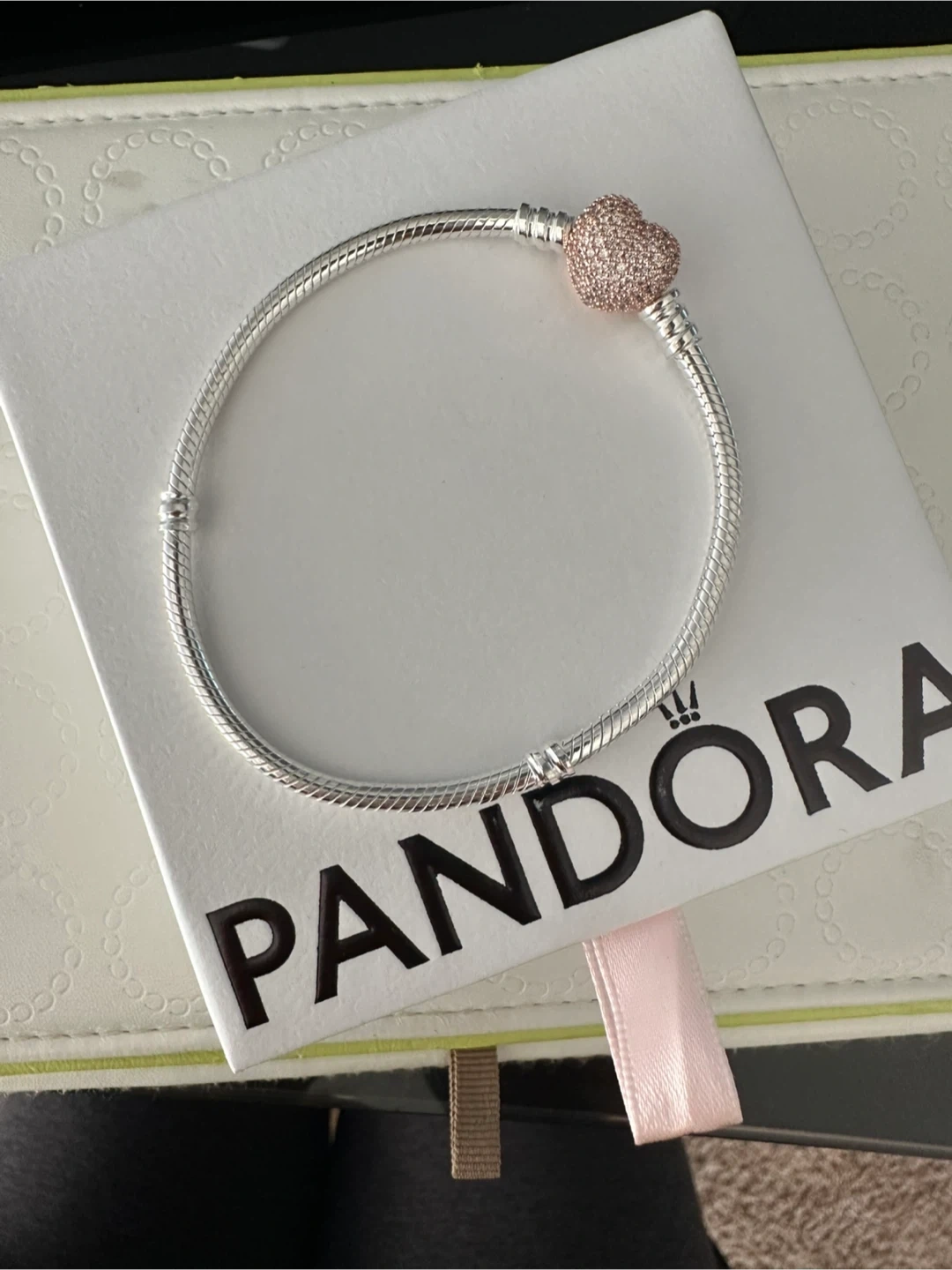 Absolutely gorgeous authentic Pandora bracelet for sale. It’s a silver bracelet with Pave Rose Gold Heart Clasp. Size 19cm / 7.5”. NEW