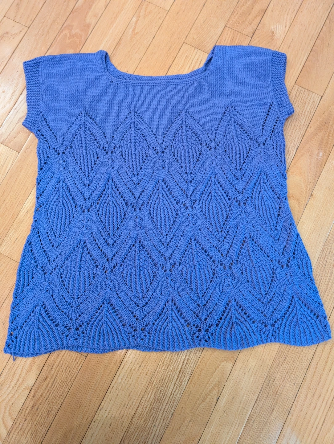 Here's a lovely blue knit sleeveless top! It features a unique leaf-like pattern throughout the front. Perfect for layering or wearing on its own during warmer weather