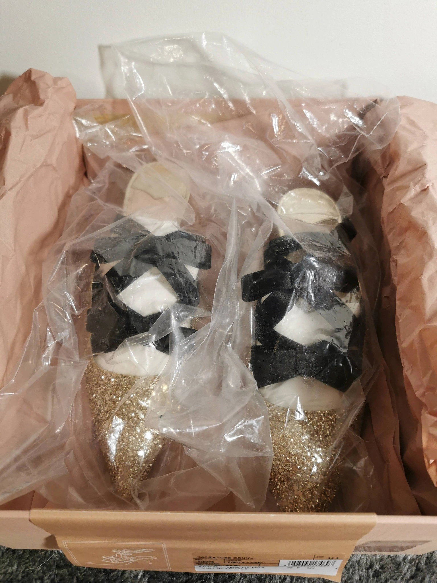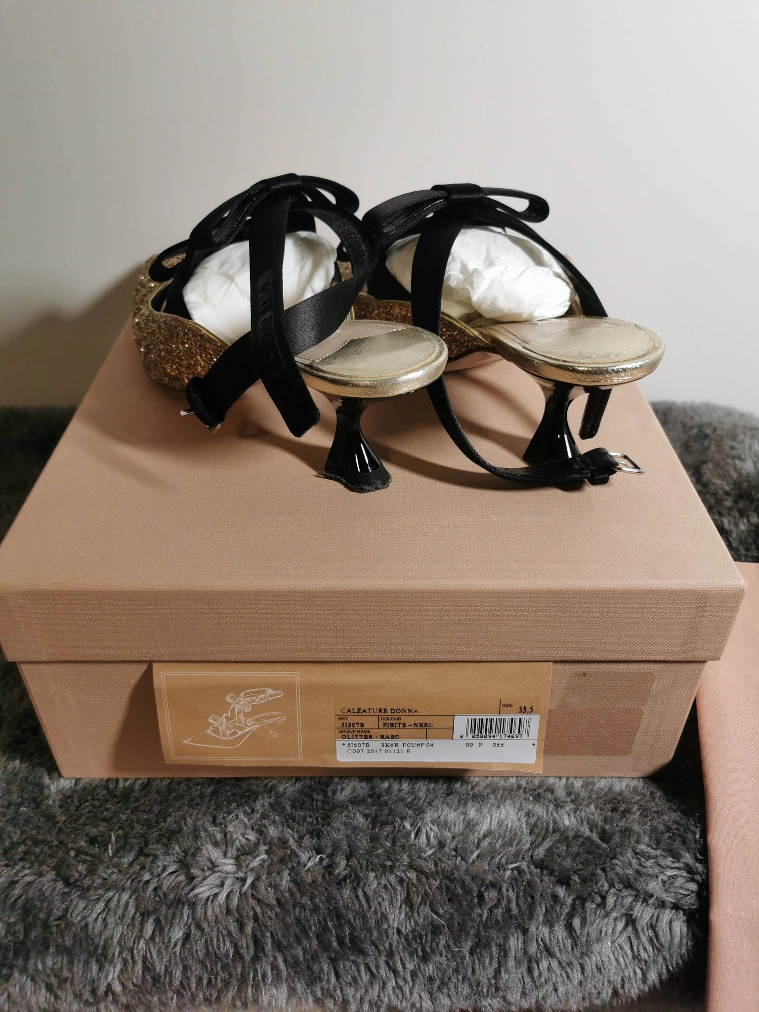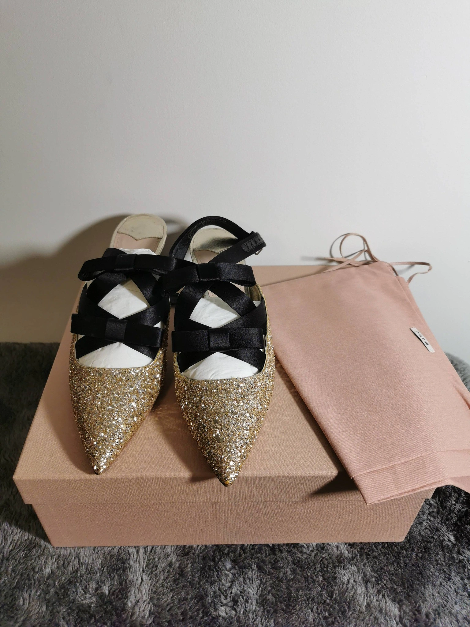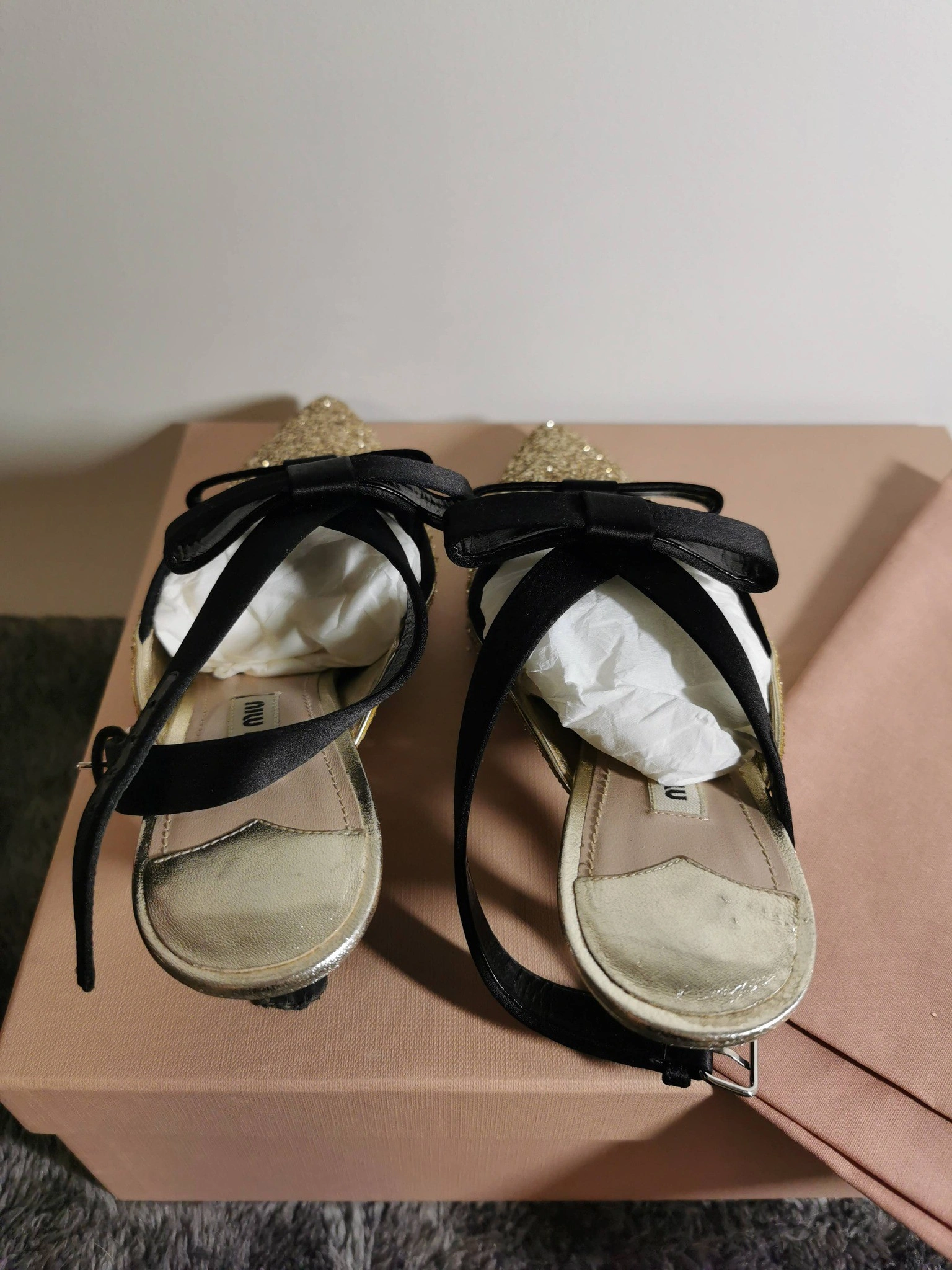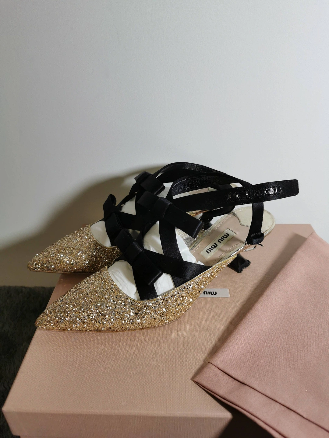 These Miu Miu heels are absolutely stunning! They feature a glittery gold exterior with elegant black ribbon detailing. Size 35.5. Comes with the original box and dust bag