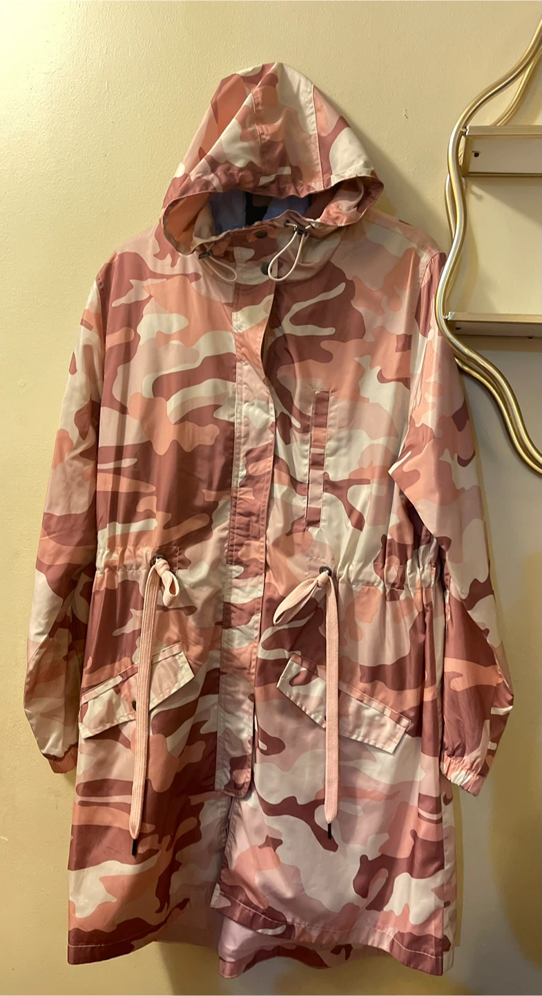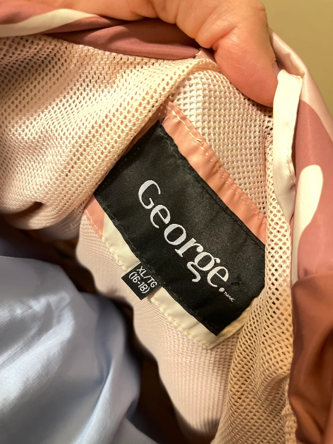 Check out this stylish George raincoat! It features a cool camo print in shades of pink, cream, and brown. It's a size XL (16-18) and has a hood, perfect for those rainy days!