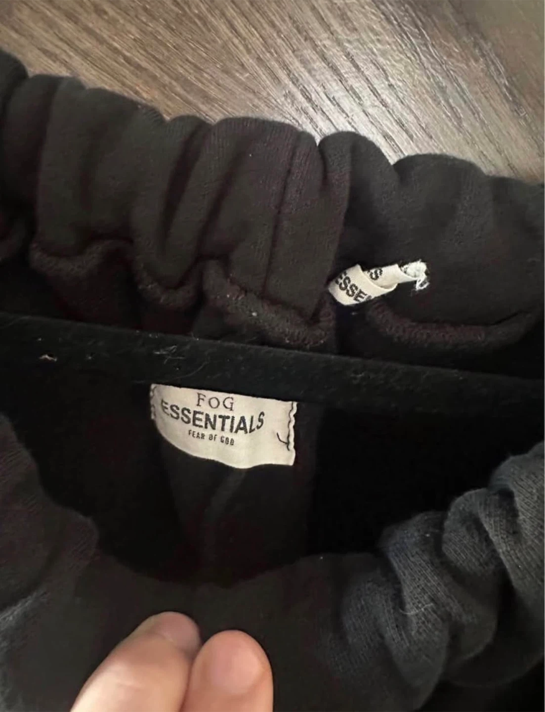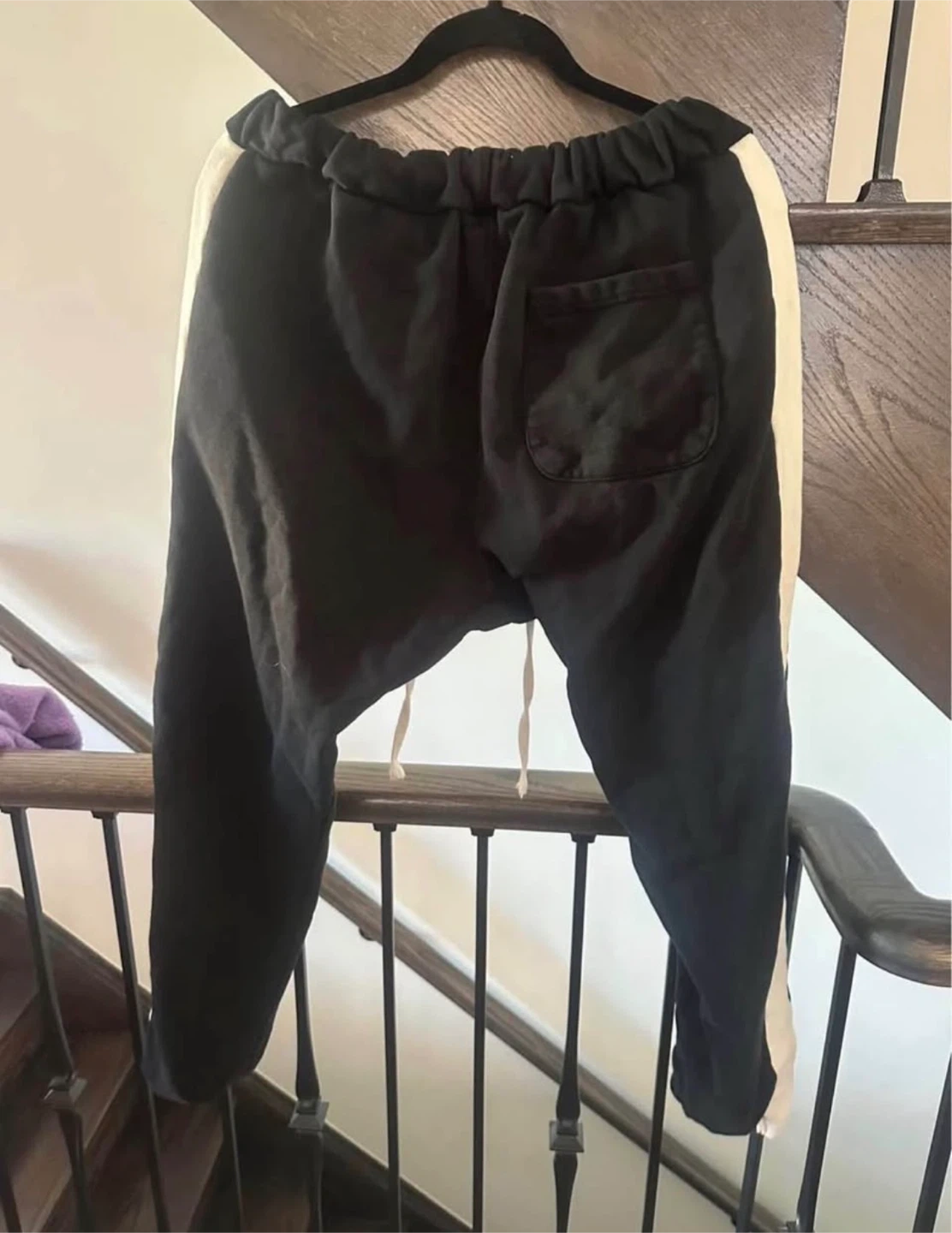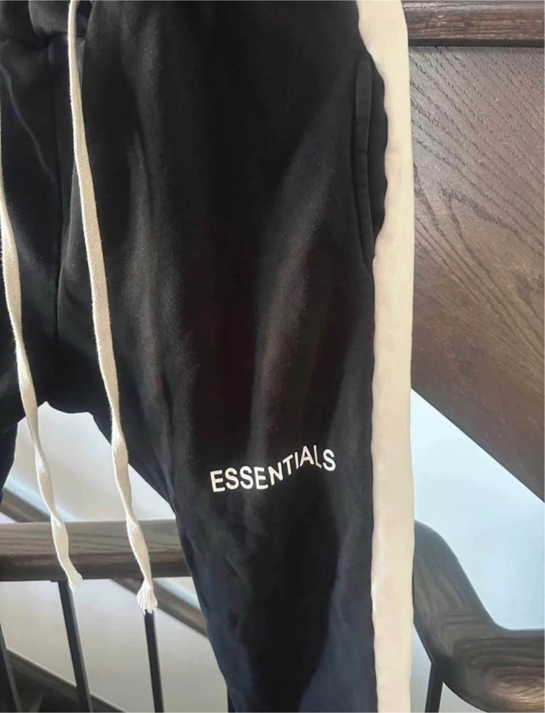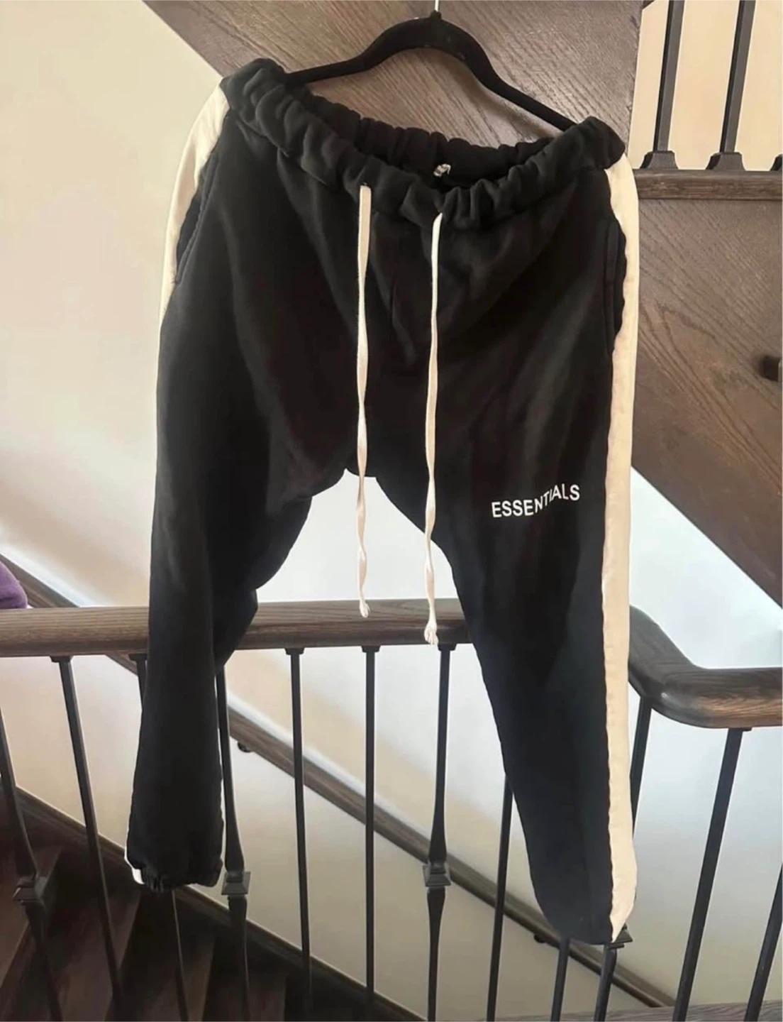 Selling a pair of FOG Essentials track pants in size medium! They are black with a white stripe down the side. Great for lounging or running errands!