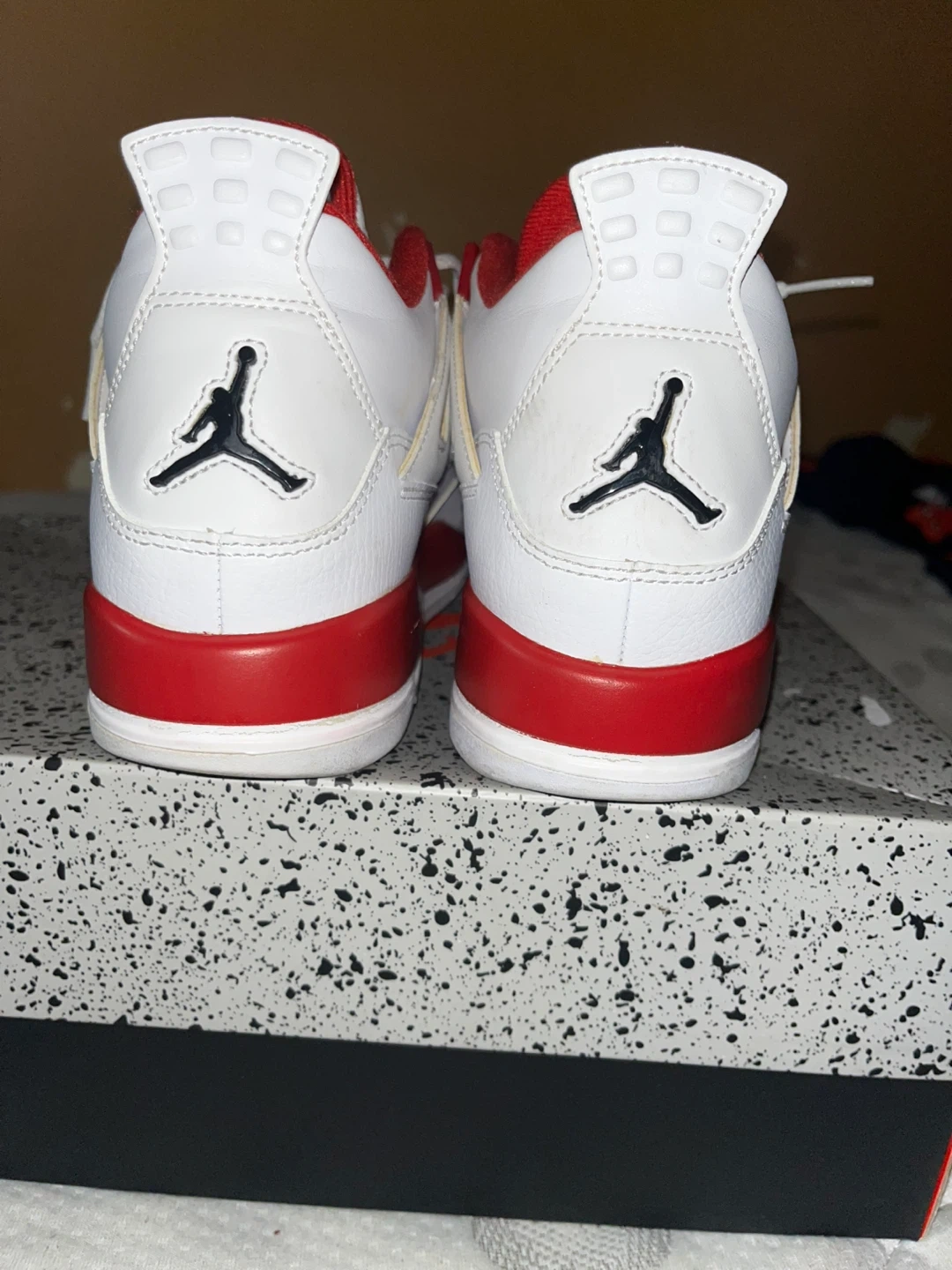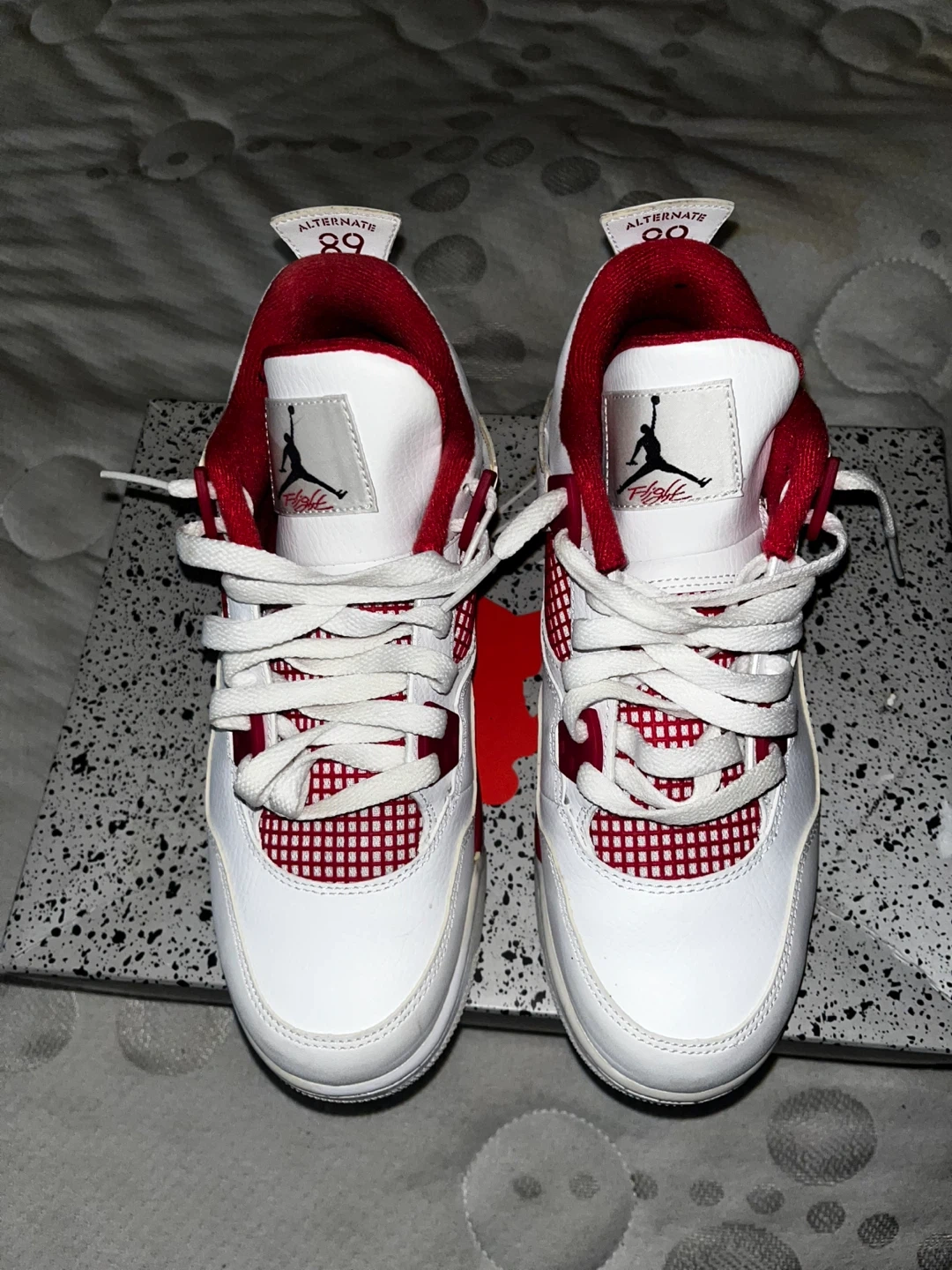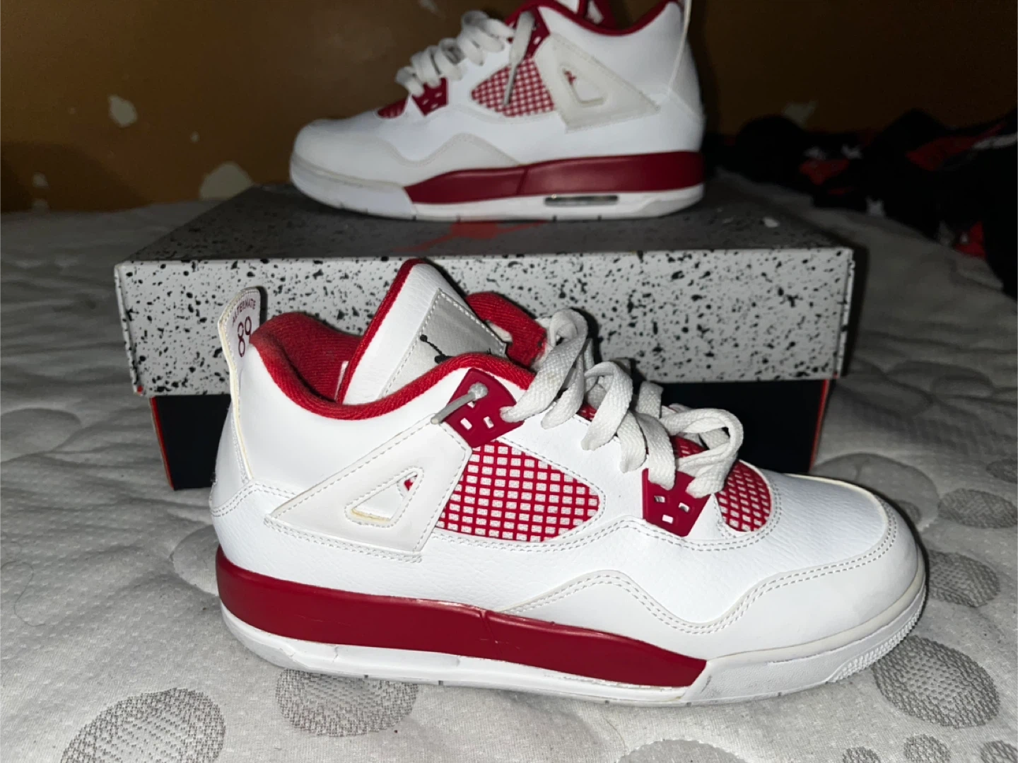 Selling a pair of Air Jordan 4 Alternate '89 sneakers in youth size. These are in great condition and come with the original box. The shoes feature a white and red colorway, perfect for any young sneakerhead!