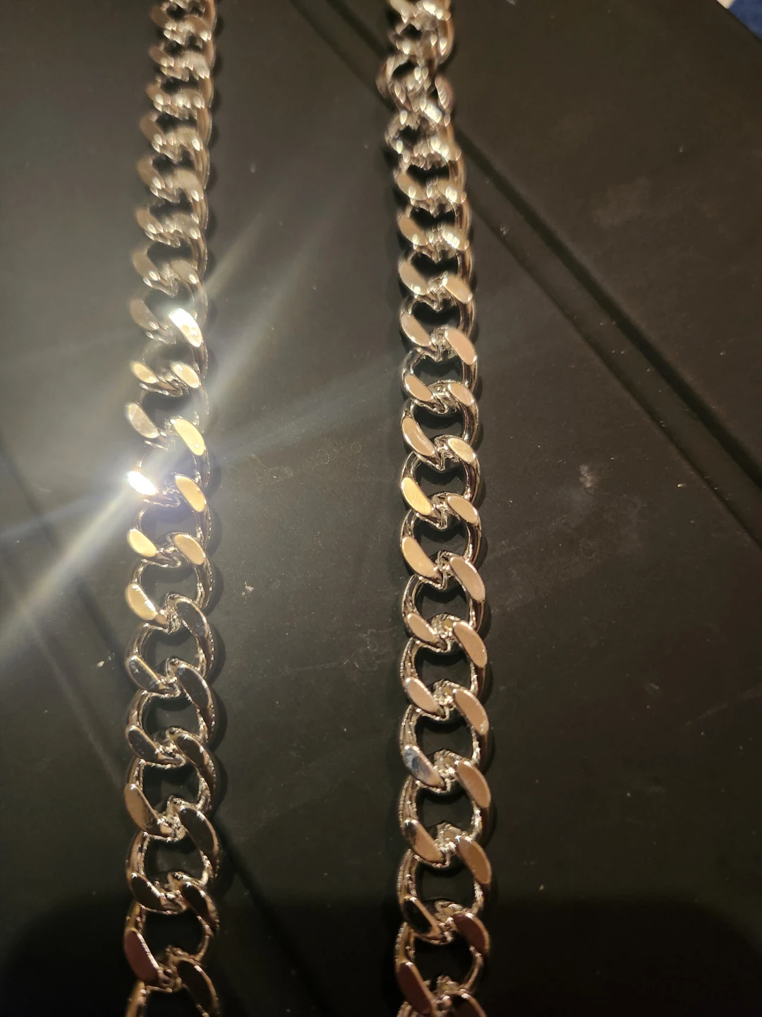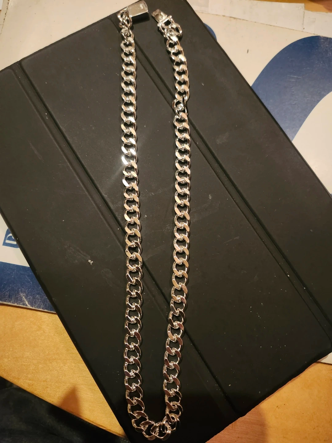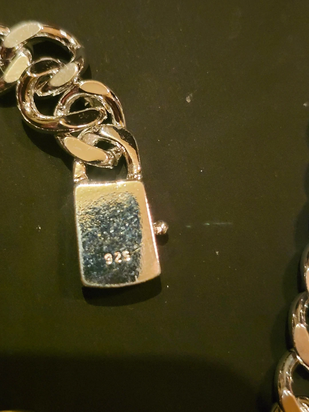 Selling a sterling silver curb chain necklace. It's in new condition and has a nice shine to it. The clasp is marked with '925', indicating it's made of sterling silver.