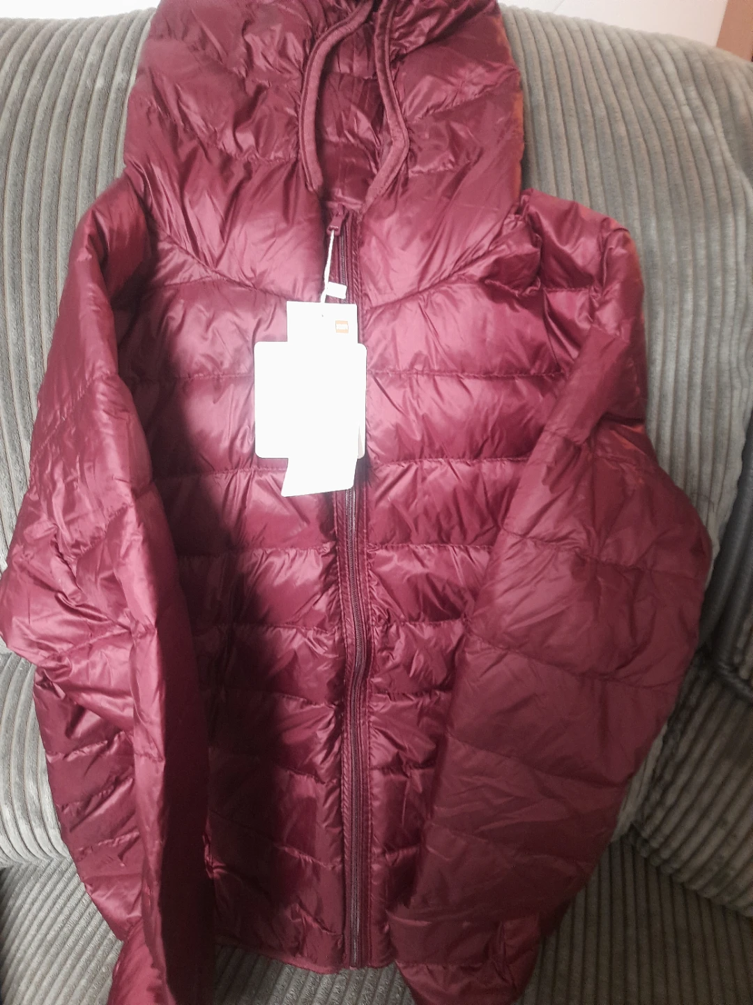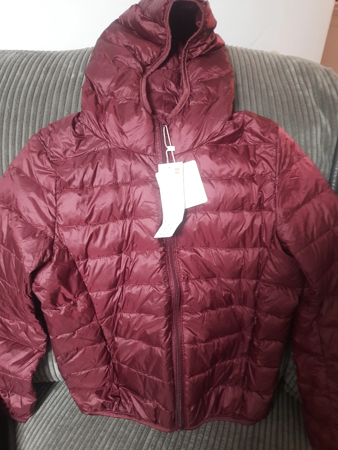 Selling a lightweight down jacket in a beautiful maroon colour! It's size L and made with 100% nylon for the face and lining, and filled with down feathers. This jacket is perfect for staying warm without feeling weighed down