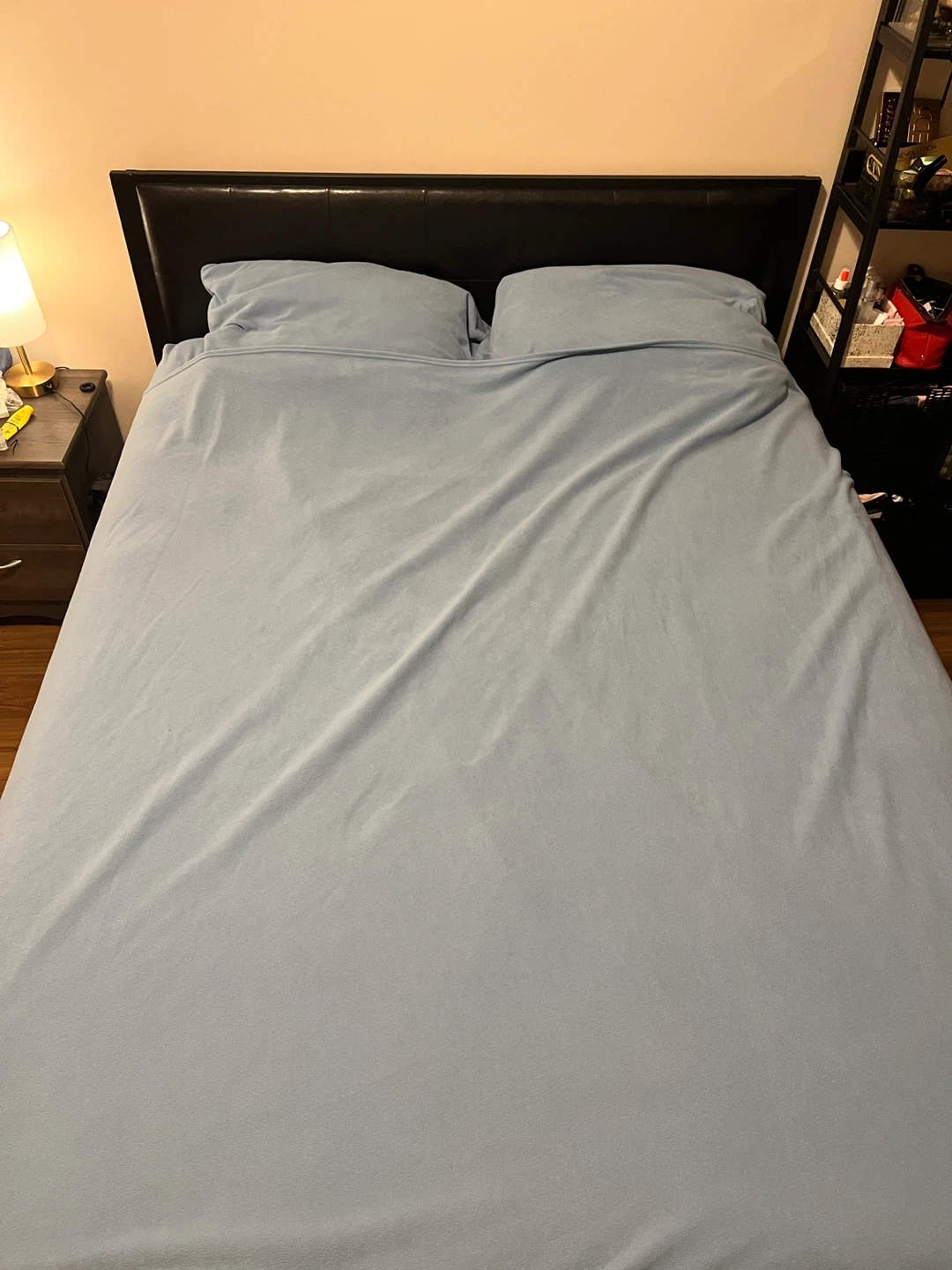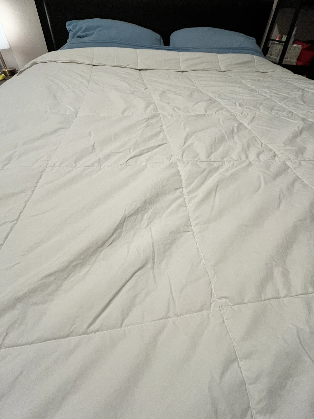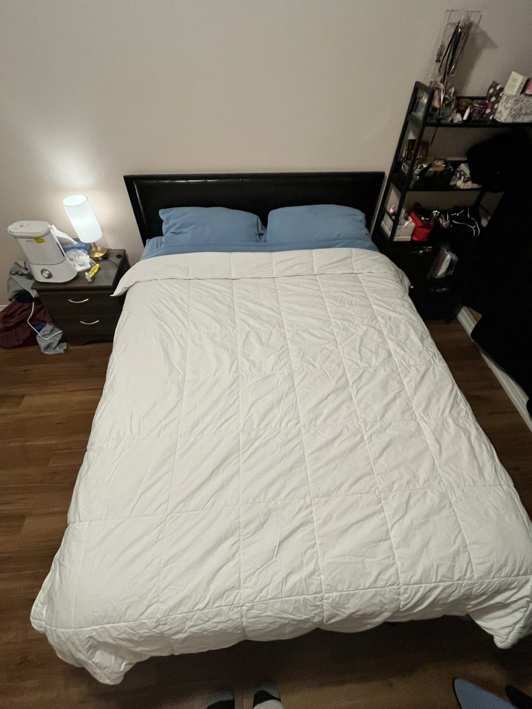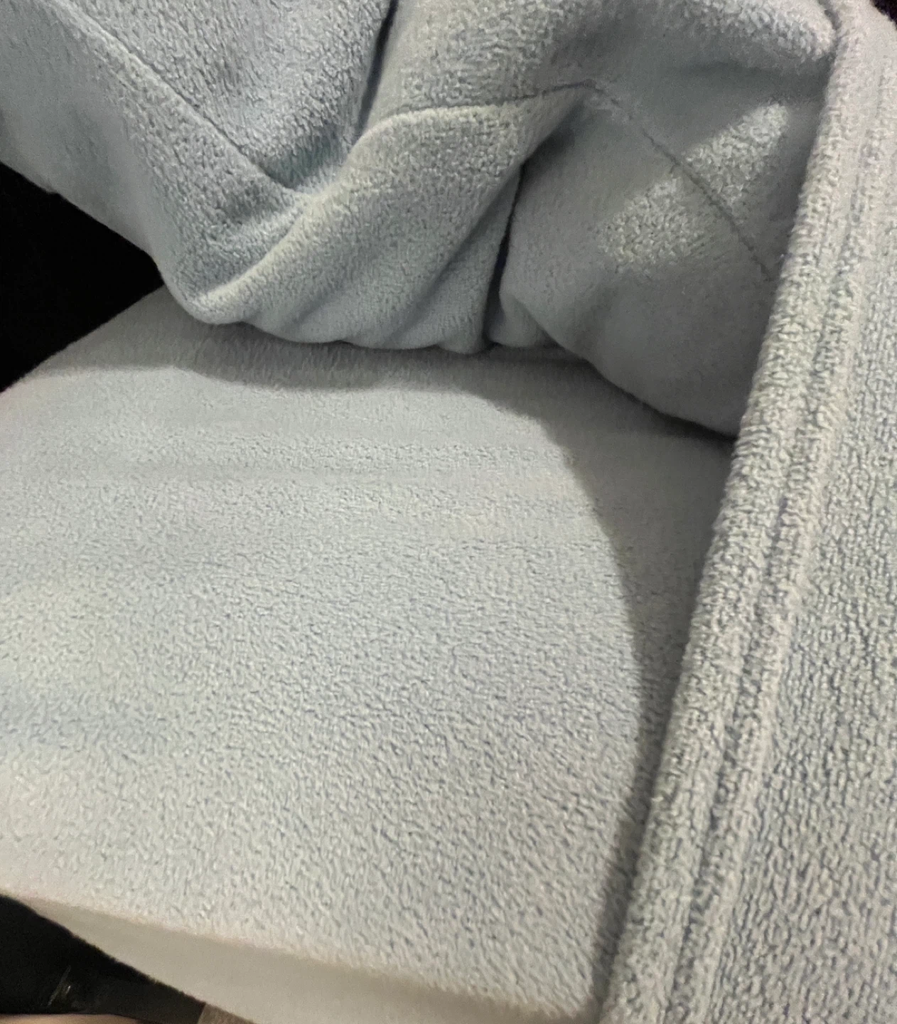 Selling a white comforter and a set of light blue fleece sheets with pillow cases. The comforter is in great shape and the fleece sheets are super soft and cozy, perfect for those cold nights!