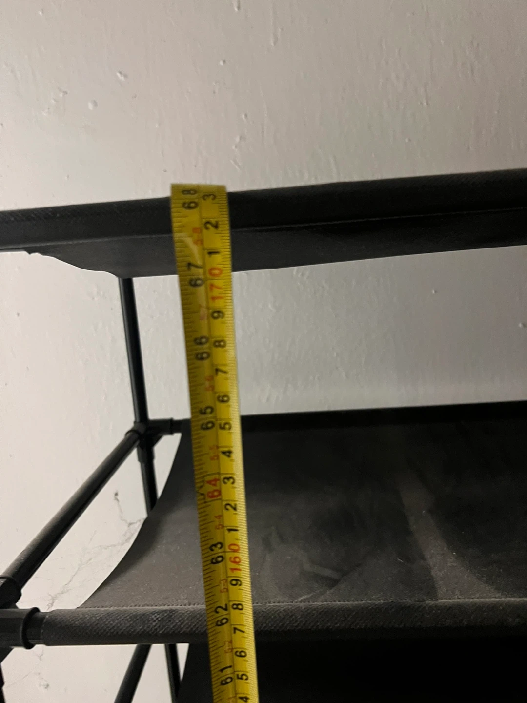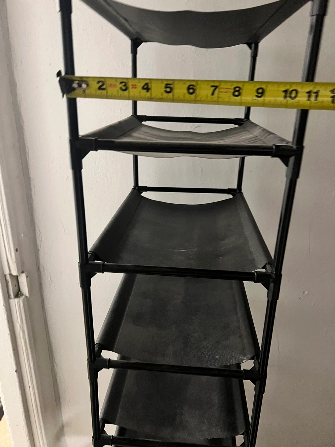 Selling a black 9-tier shoe rack. It's in great condition and ready to organize your shoes! It measures approximately 68 inches tall and about 10 inches wide.