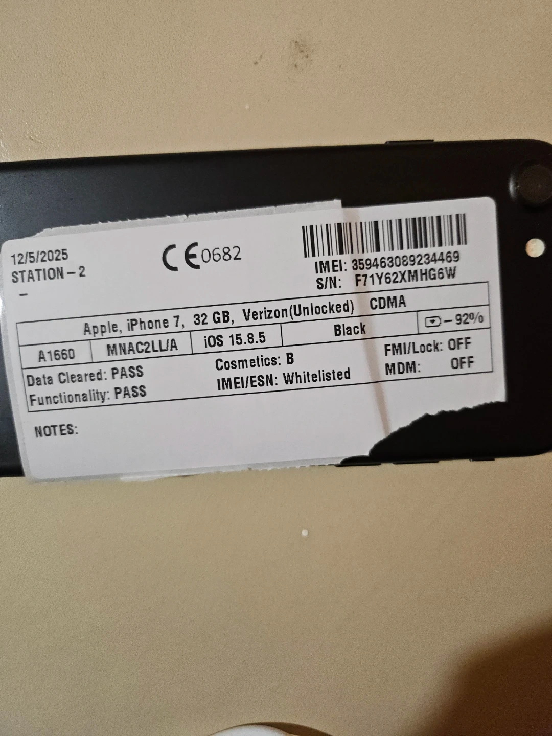Selling an Apple iPhone 7 with 32GB of storage in black. It's unlocked for use on any carrier. The phone has been data cleared and functionality is tested to pass. Please note that the cosmetics are graded as B.