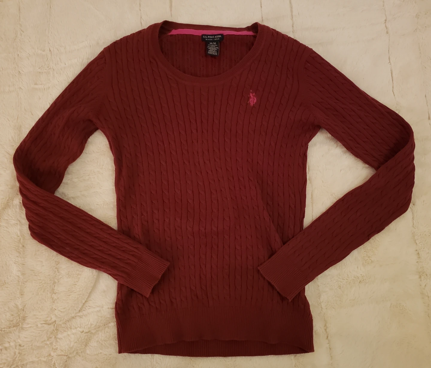 Selling a U.S. Polo Assn. sweater in a lovely burgundy colour! It's a size medium and features a classic cable knit design. Perfect for adding a touch of warmth and style to your wardrobe! Selling because I dont wear it much.