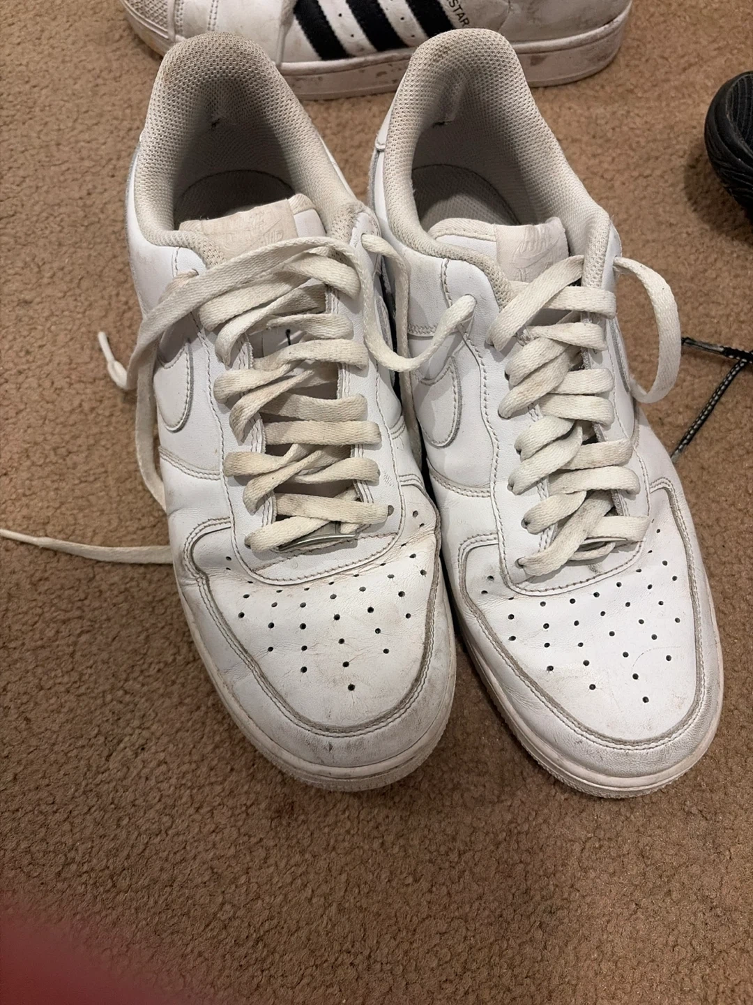Selling a pair of white Nike Air Force 1 sneakers! They show some signs of wear, but still have plenty of life left in them. Perfect for everyday wear or hitting the streets in style