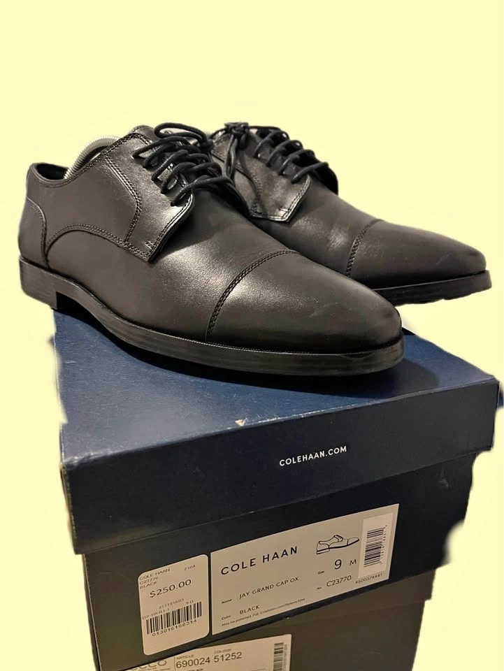 Step up your shoe game with these Cole Haan Jay Grand Cap Oxford shoes in men's size 9. These leather dress shoes have a sleek, classic look that's perfect for any formal or business occasion. Being sold in brand new condition.