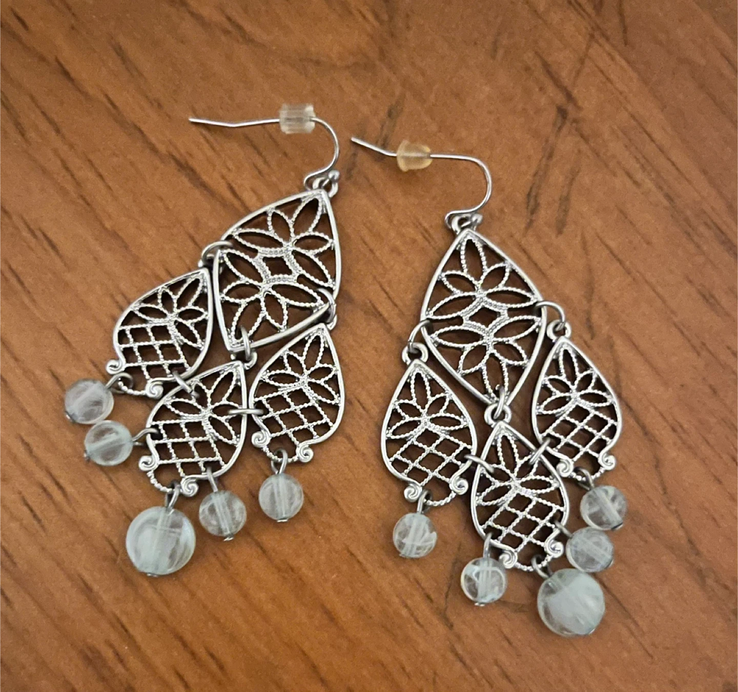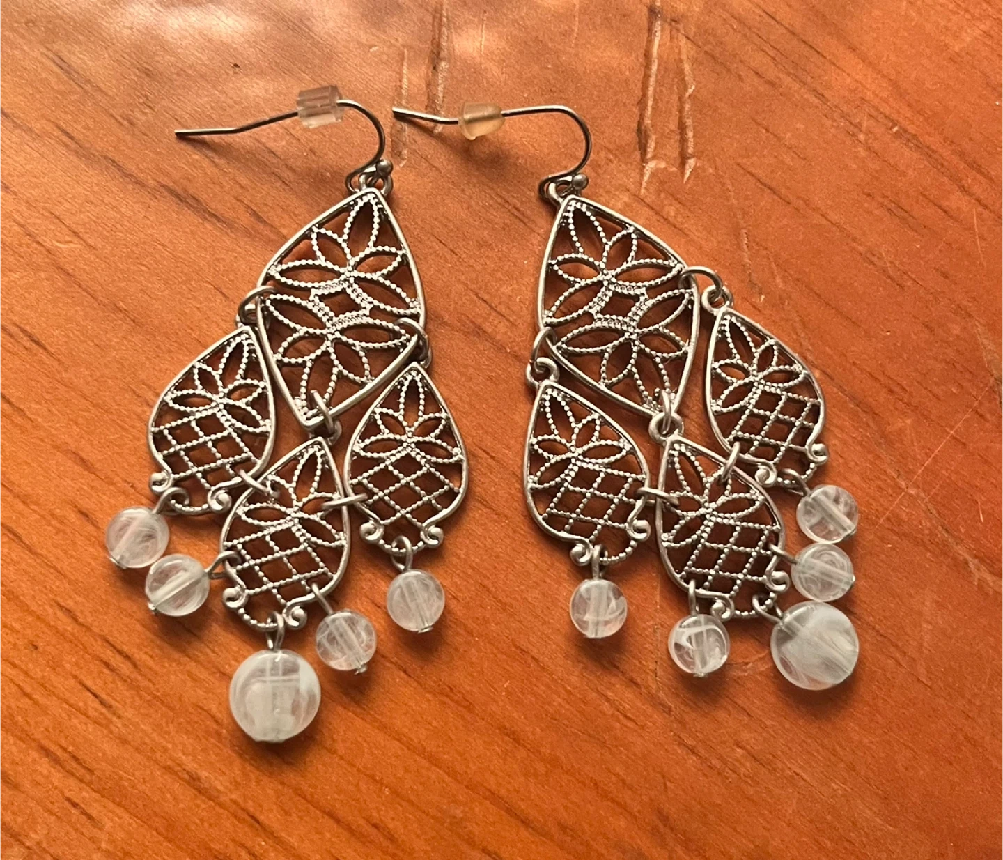 These silver-tone dangle earrings are a lovely addition to any outfit! They feature a unique filigree design with small, clear beads that catch the light beautifully. Perfect for adding a touch of elegance to your look
