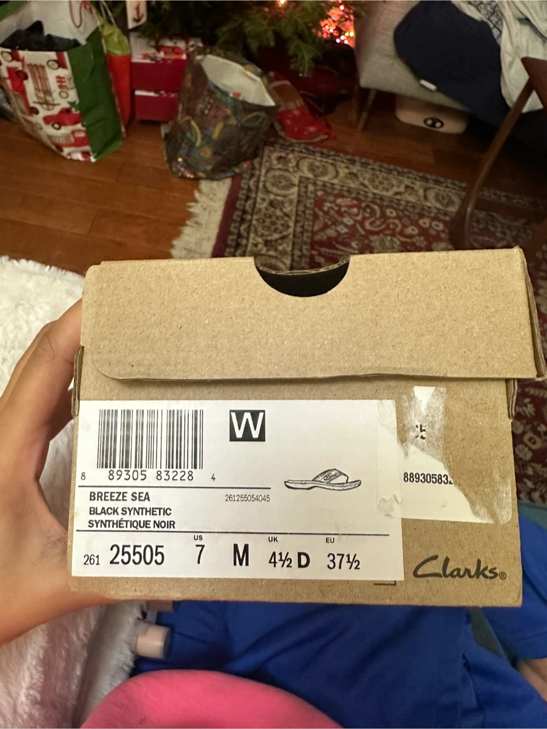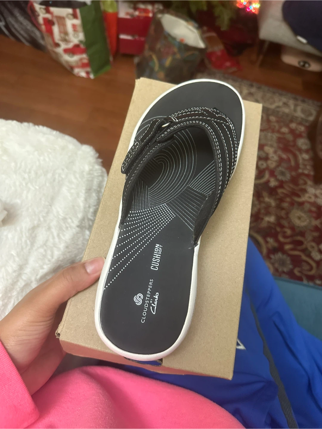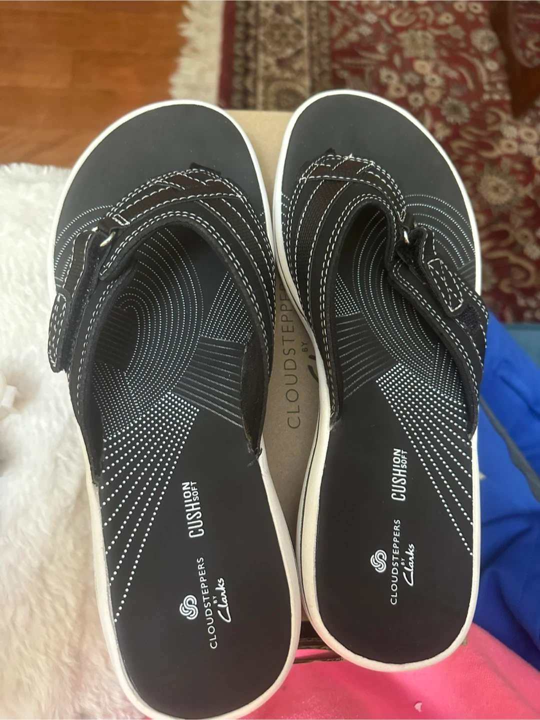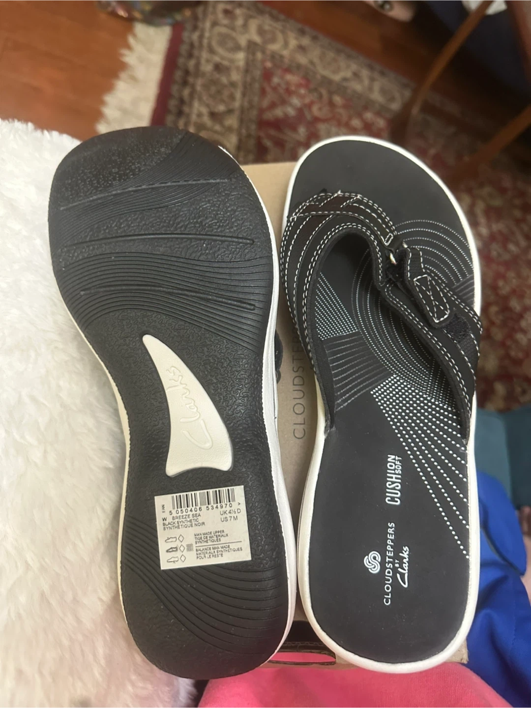 These Clarks Cloudsteppers Breeze Sea sandals are super comfy! They are black synthetic and a women's size 7. Comes with the original box and brand new.