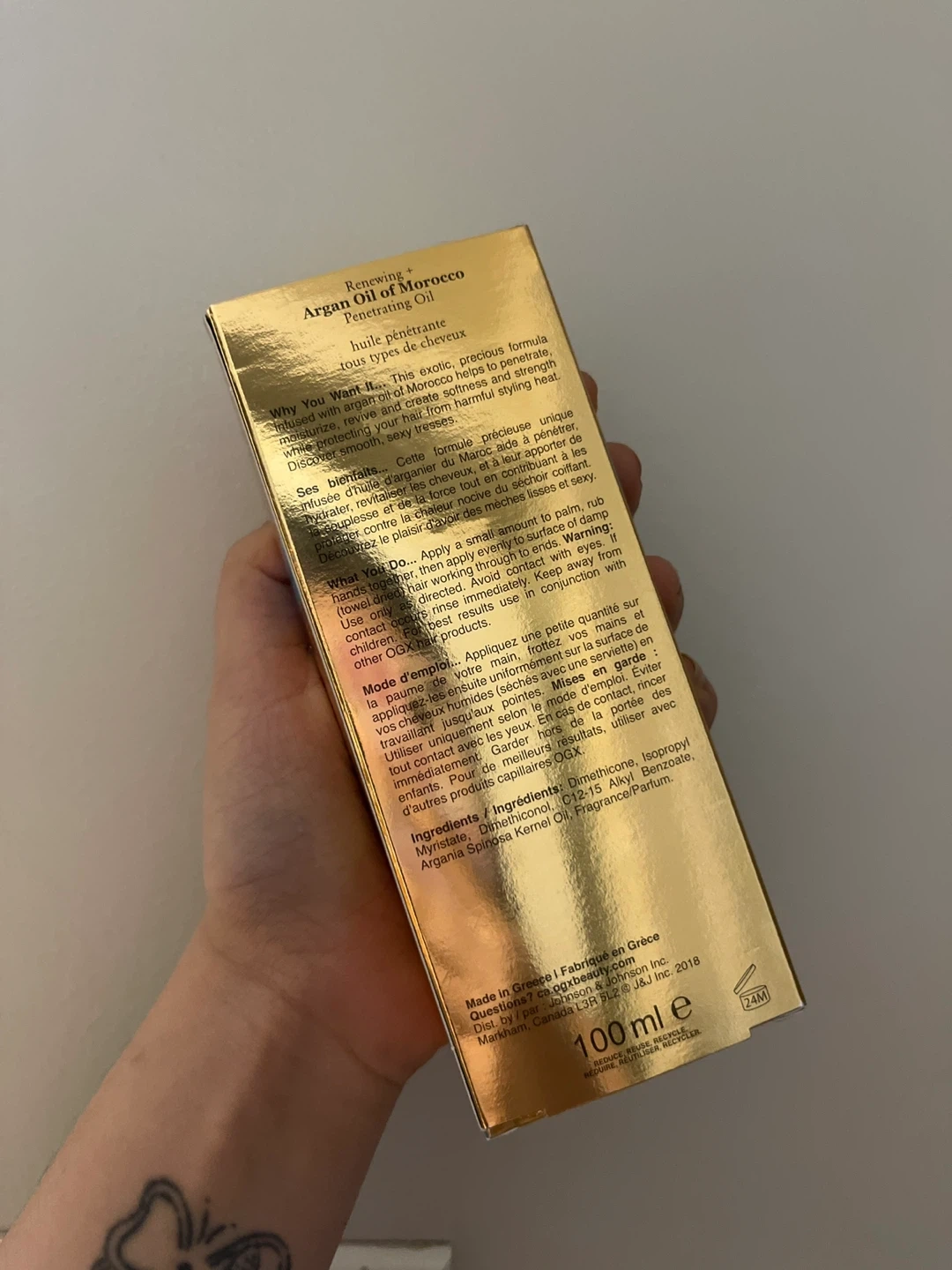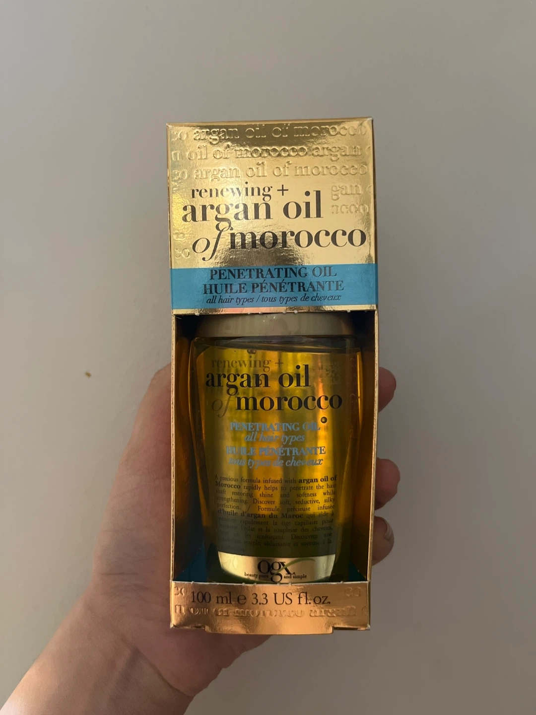 Selling a bottle of OGX Renewing Argan Oil of Morocco Penetrating Oil! It's a formula infused with argan oil of Morocco, helping to moisturize, revitalize, and give your hair softness and strength while protecting it from harmful styling heat. The bottle contains 100 ml (3.3 US fl.oz).