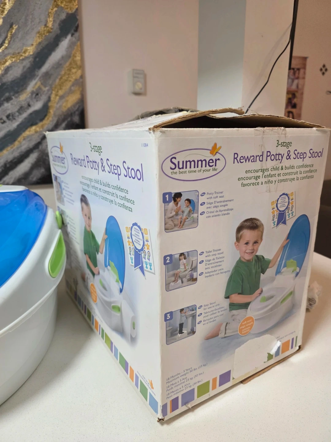 Unused, openbox. Selling a Summer 3-Stage Reward Potty & Step Stool. It's a great tool to encourage your child and builds confidence. It can be used as a potty, trainer seat, or step stool. Recommended for kids 18 months and up to 50 lbs. Comes with the box