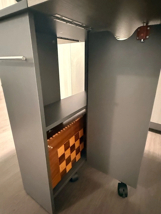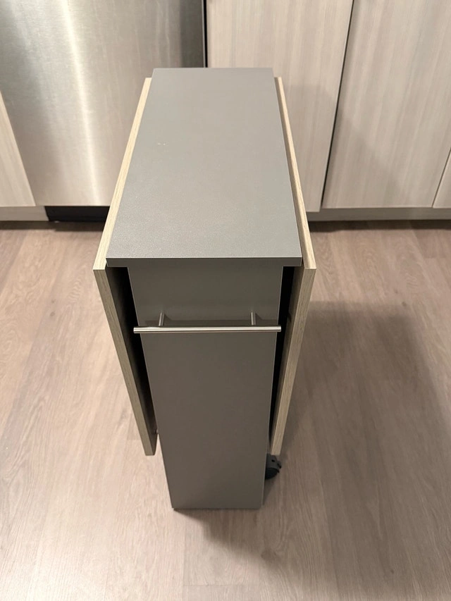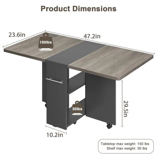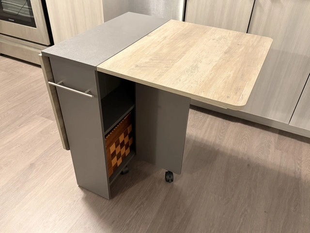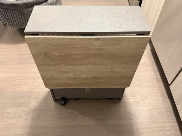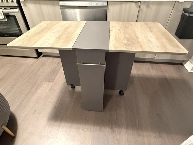 Multipurpose table. Easily folded and extended to meet your different needs. As a dining table it perfect fit for family of 4-6 when totally extended. Just folding one tabletop, it could as an office desk placed your computer, books, camera on the tabletop, or even as a entryway table when fully folded. Cash accepted.