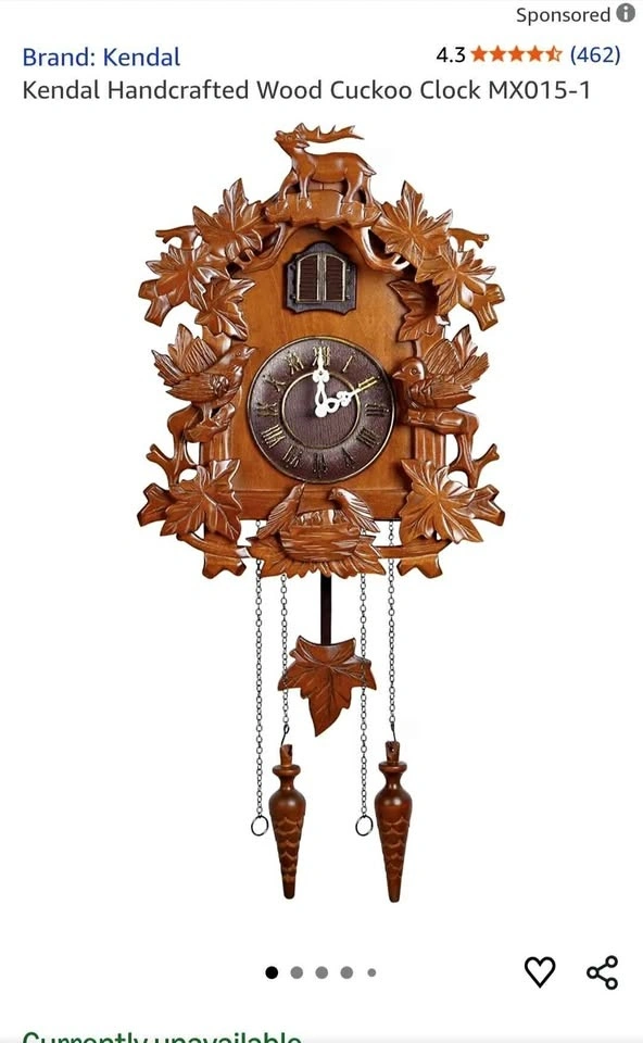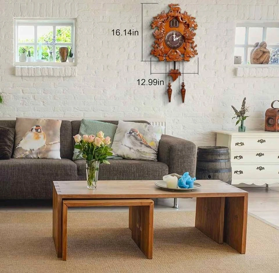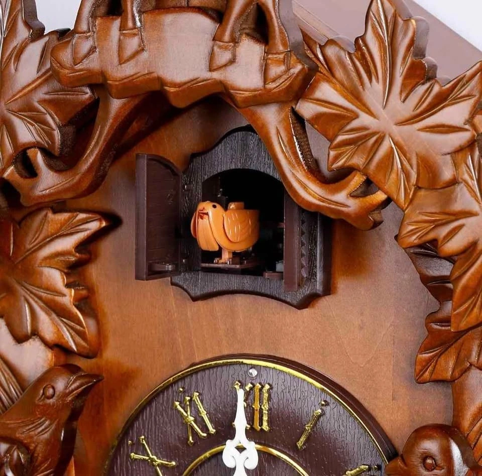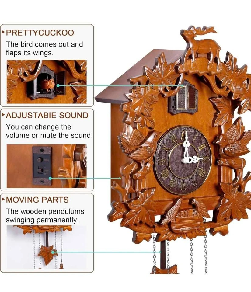 - Solid Wood, Forest Deer style cuckoo clock with hand-carved decorations.