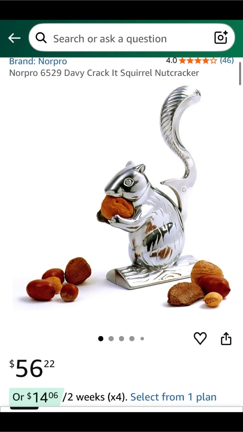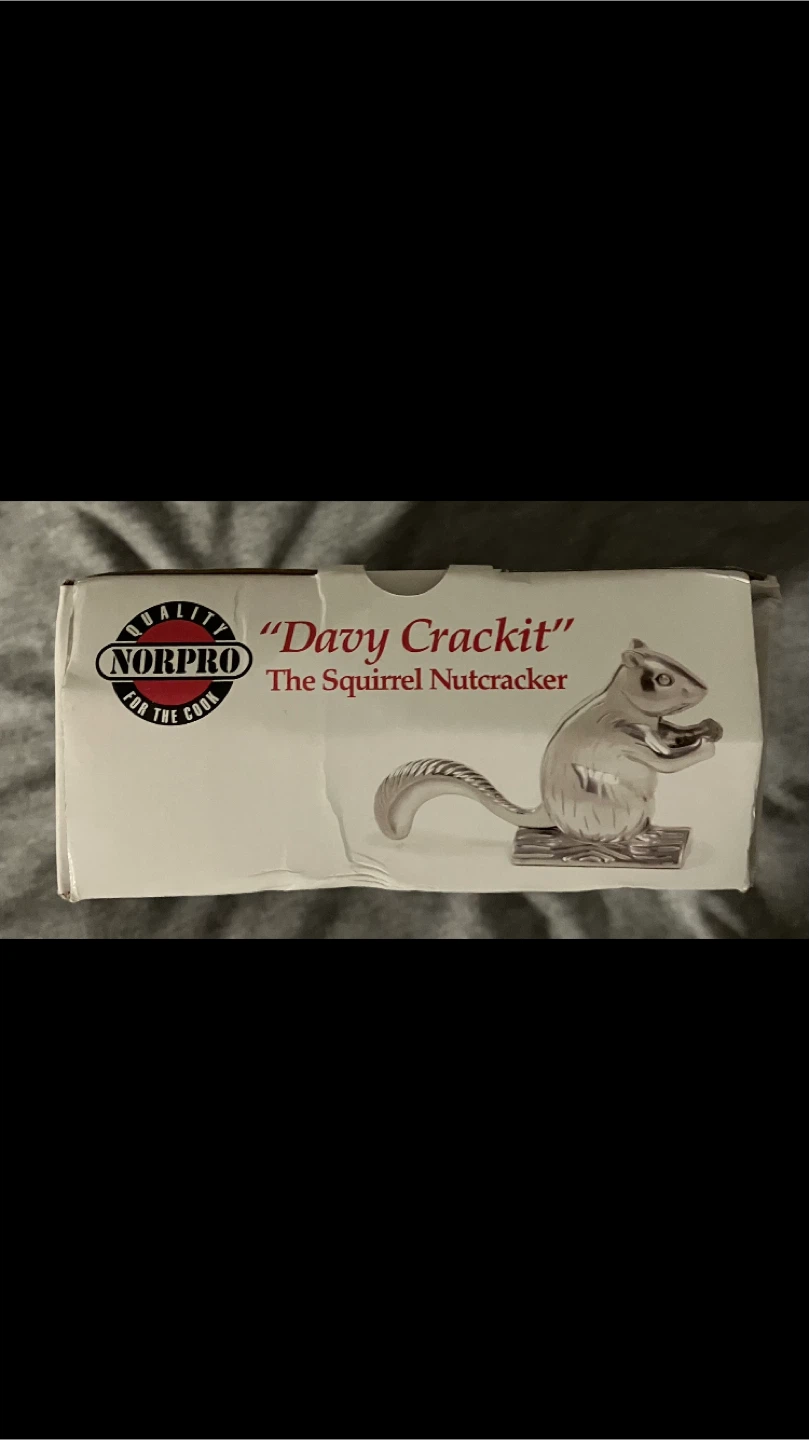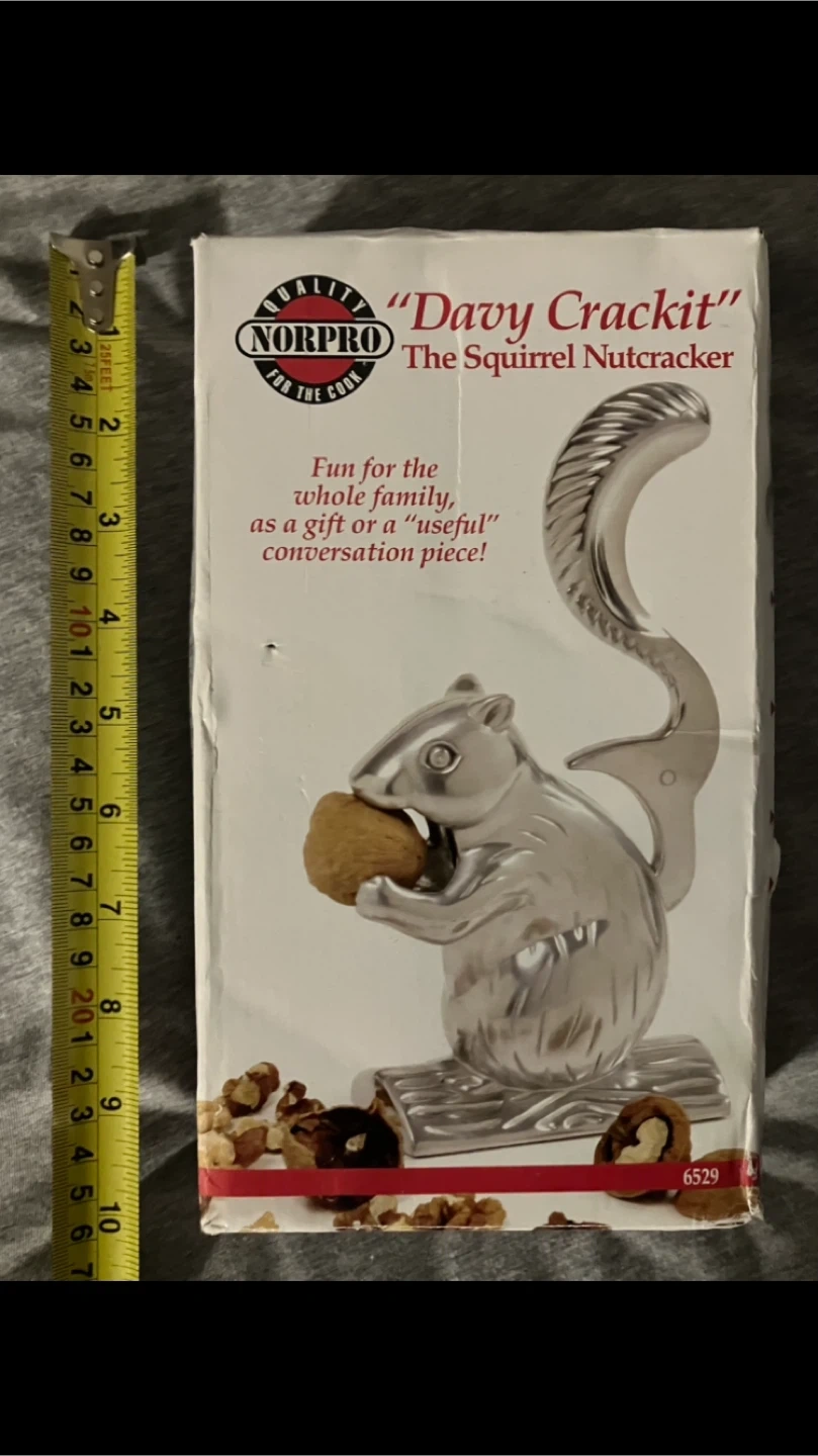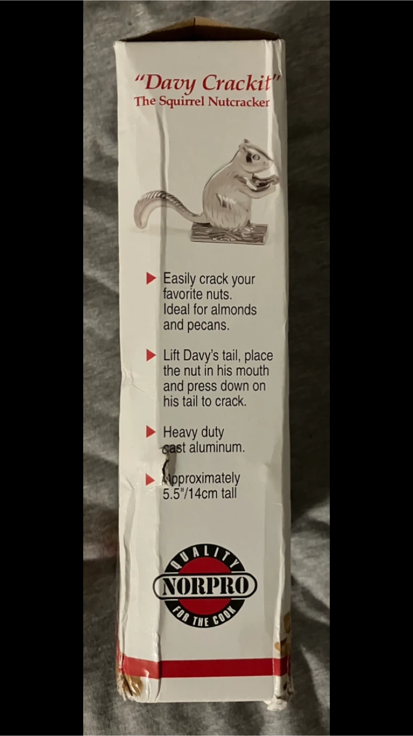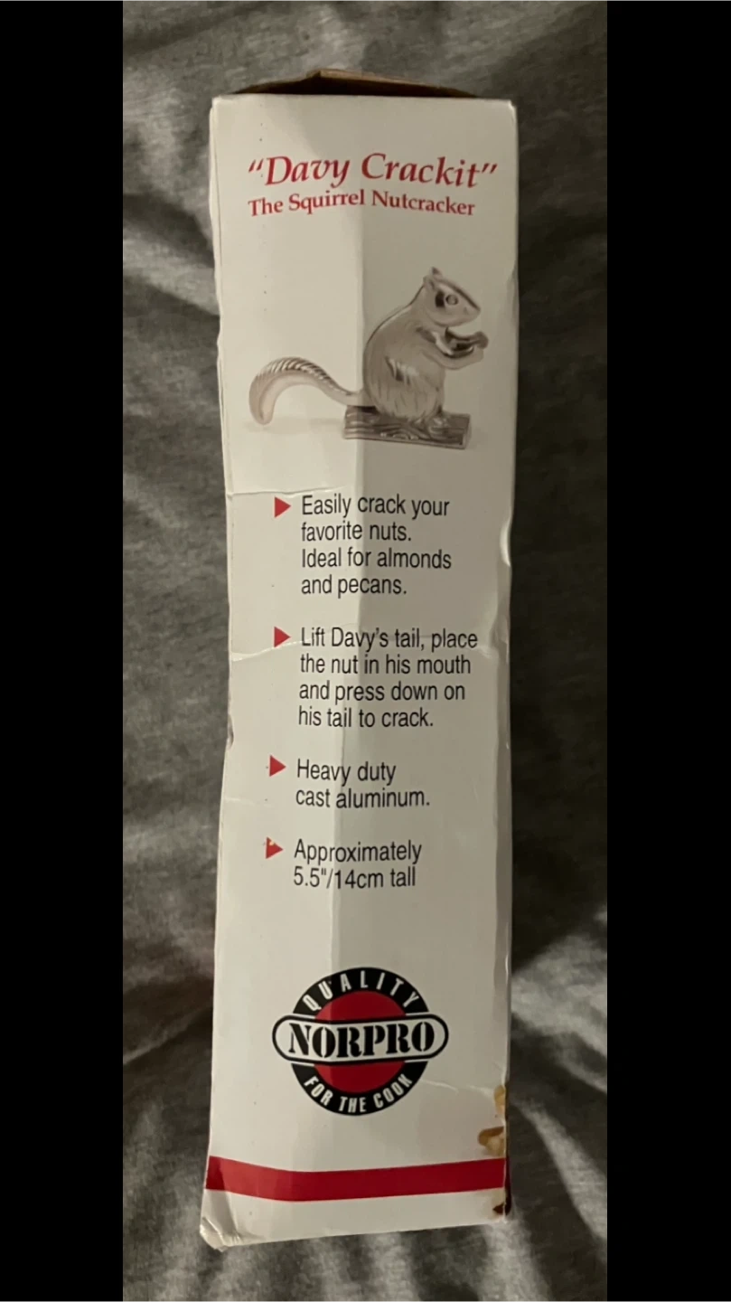 I'm selling a Norpro "Davy Crackit" Squirrel Nutcracker! It's a fun conversation piece for the whole family. It's designed to easily crack your favourite nuts, ideal for almonds and pecans. Made of heavy-duty cast aluminum and approximately 5.5" inches/14cm tall. The box is included.