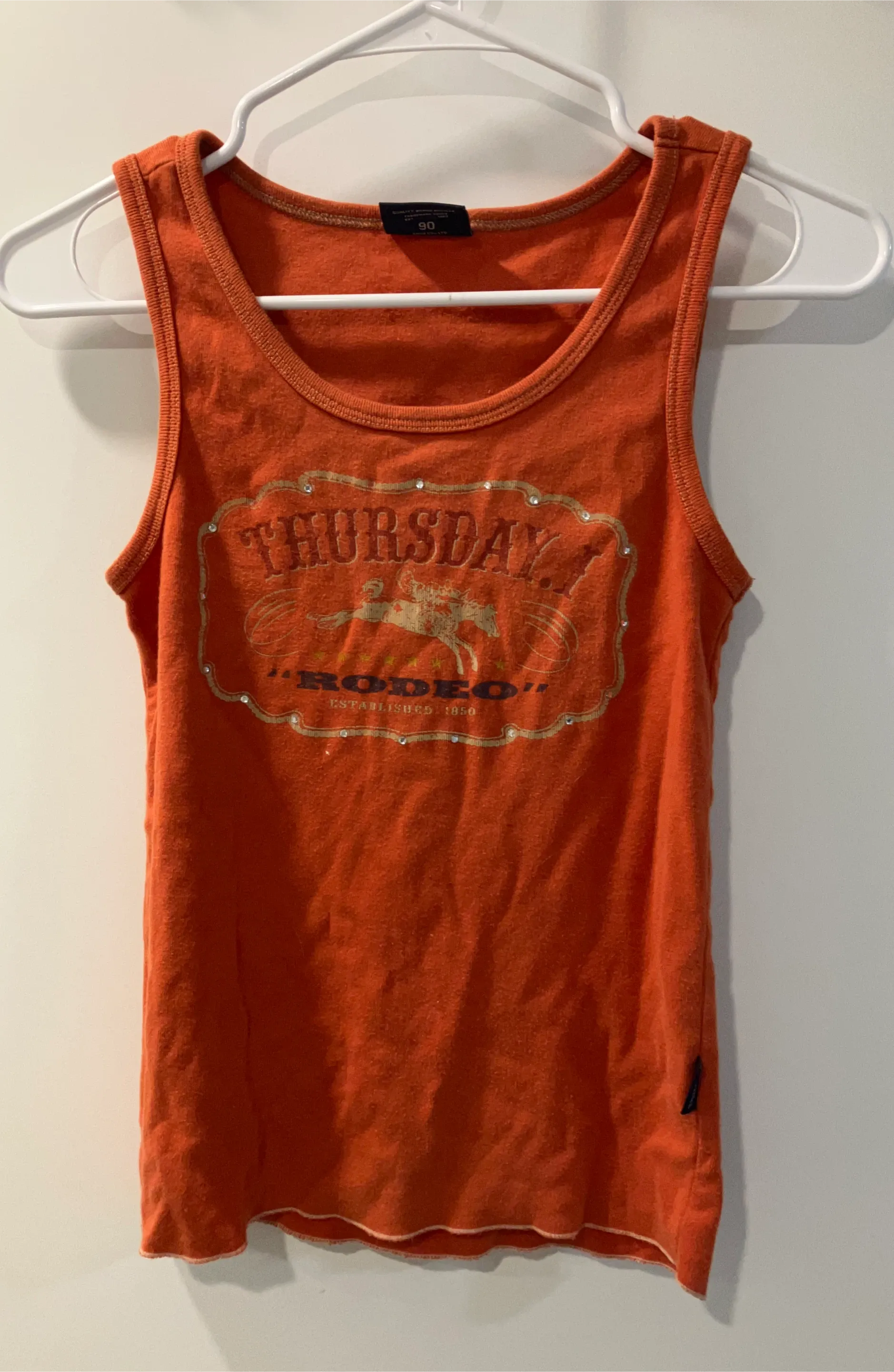 Selling a cute orange tank top with a "Thursday Rodeo" design. It's a size small and in good condition. Perfect for a casual summer look!