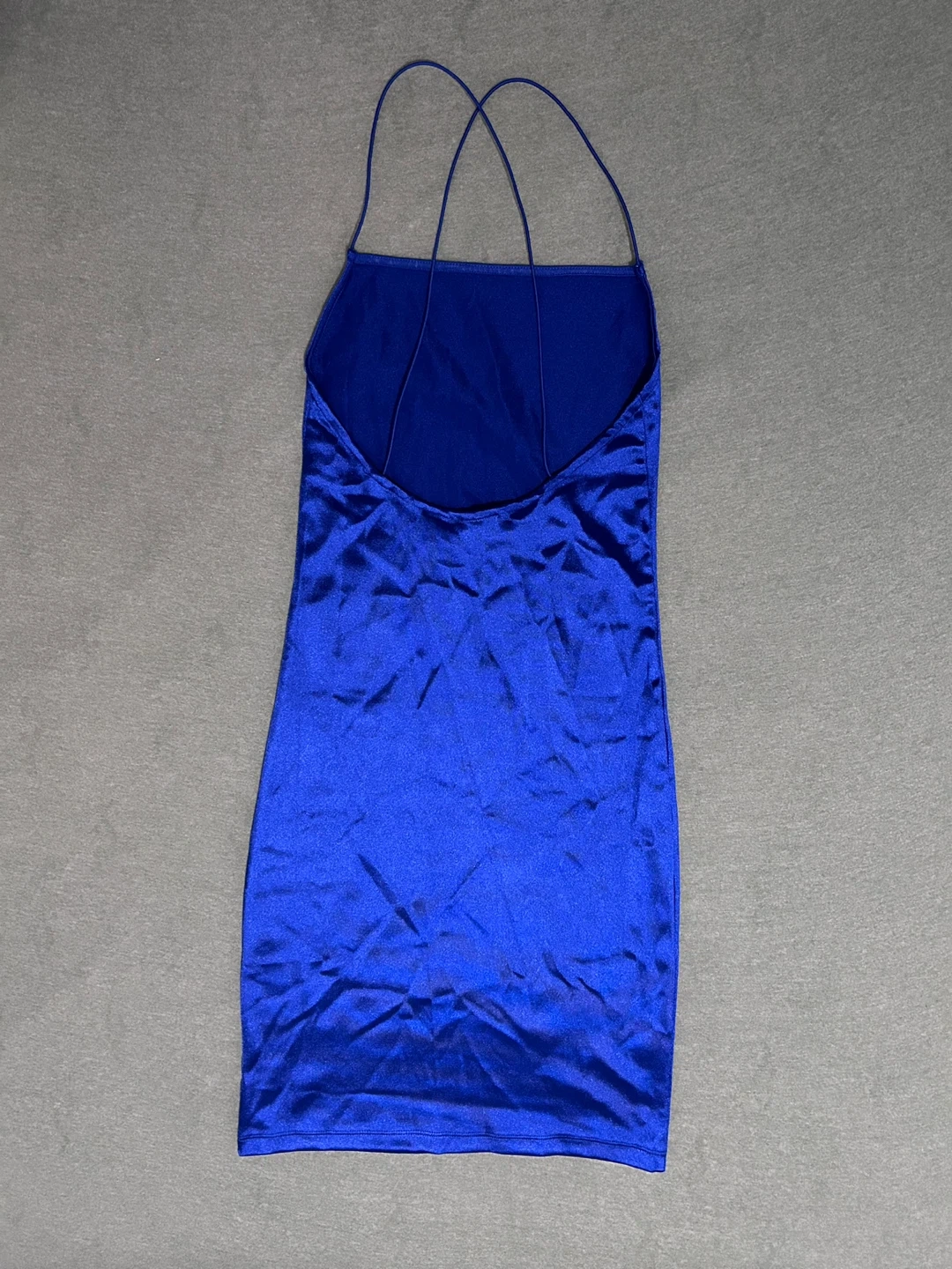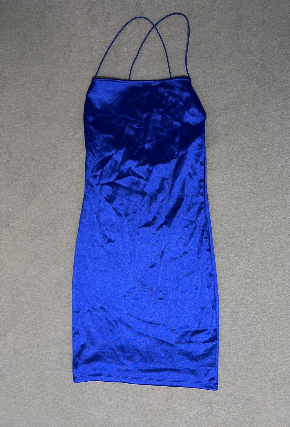 Here's a cute H&M blue mini dress! Never worn. It's in great condition and perfect for a night out. The material feels like satin and it has thin straps.