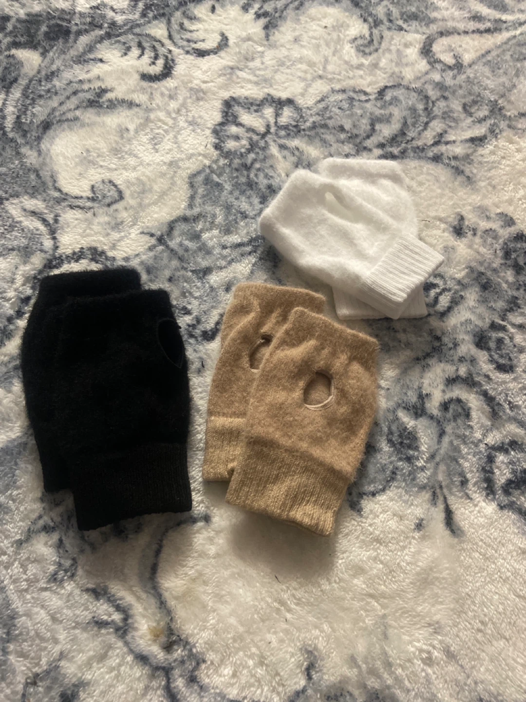 Selling a set of fingerless gloves in three colours: black, beige, and white. They're perfect for keeping your hands warm while still allowing you to use your fingers