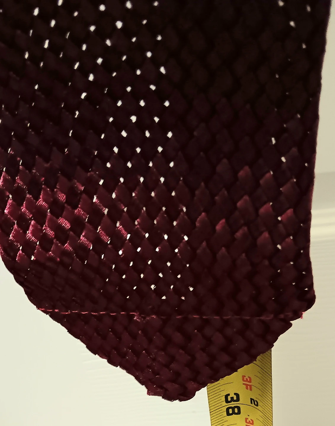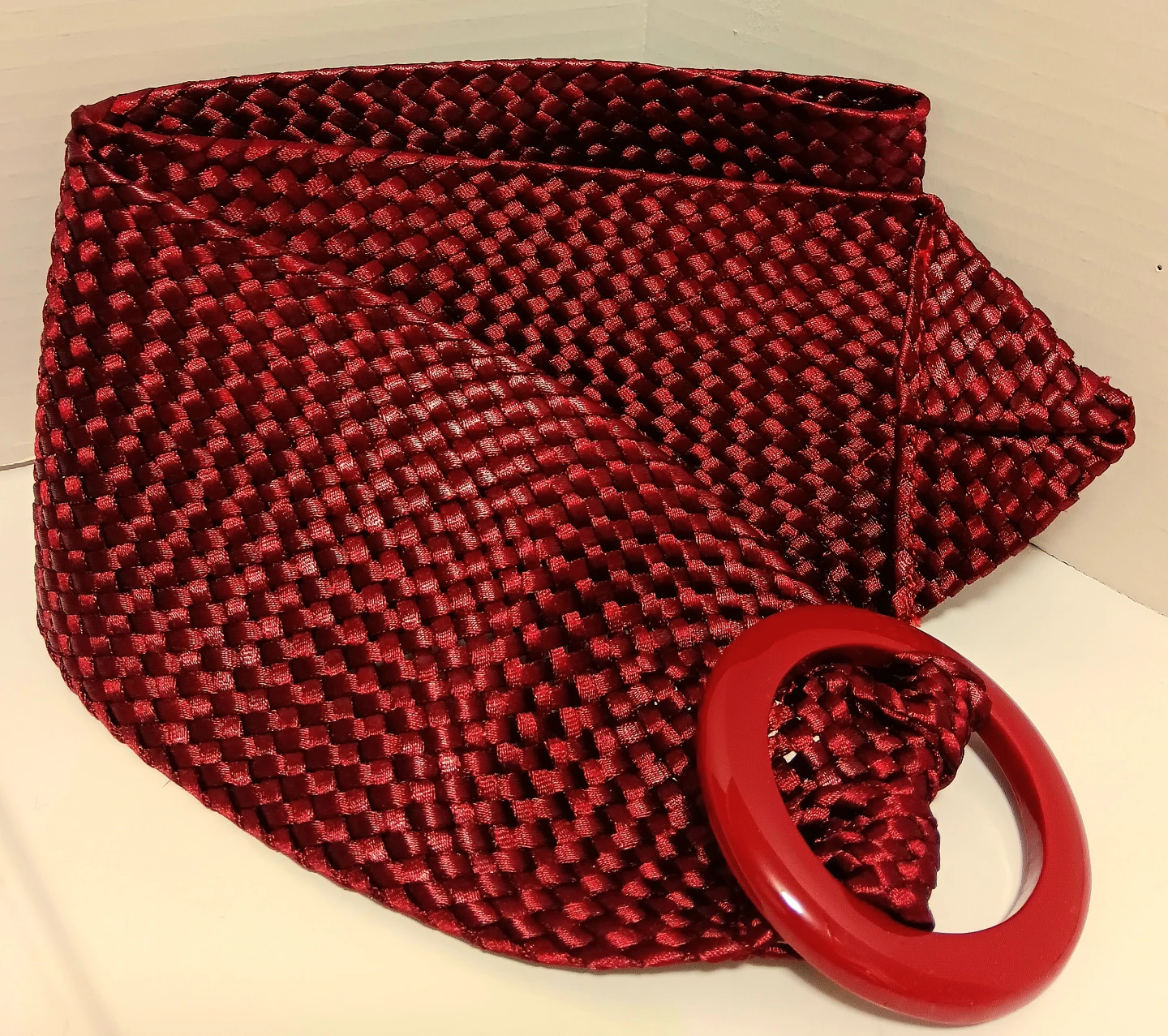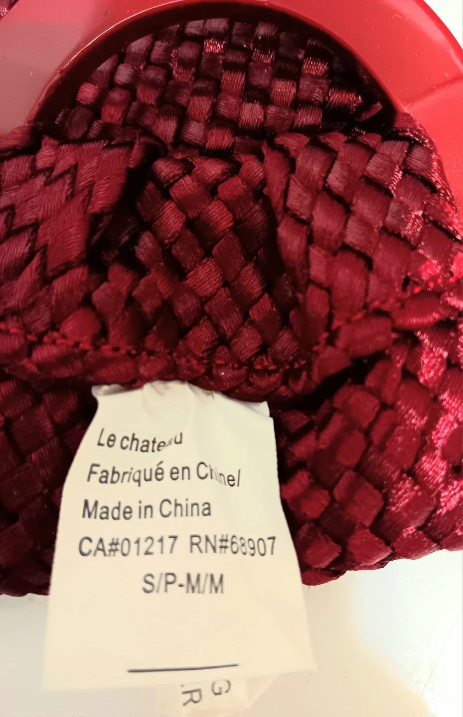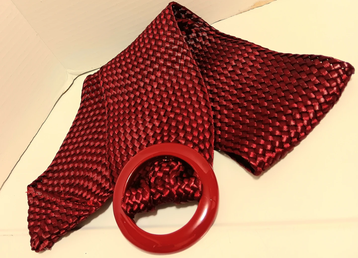 This is a Le Chateau belt. It's a stylish burgundy colour with a unique braided texture, complemented by a matching burgundy, round buckle. Perfect for cinching a dress or adding flair to any outfit, this belt is in excellent condition. The size is S/P - M/M - L/G.