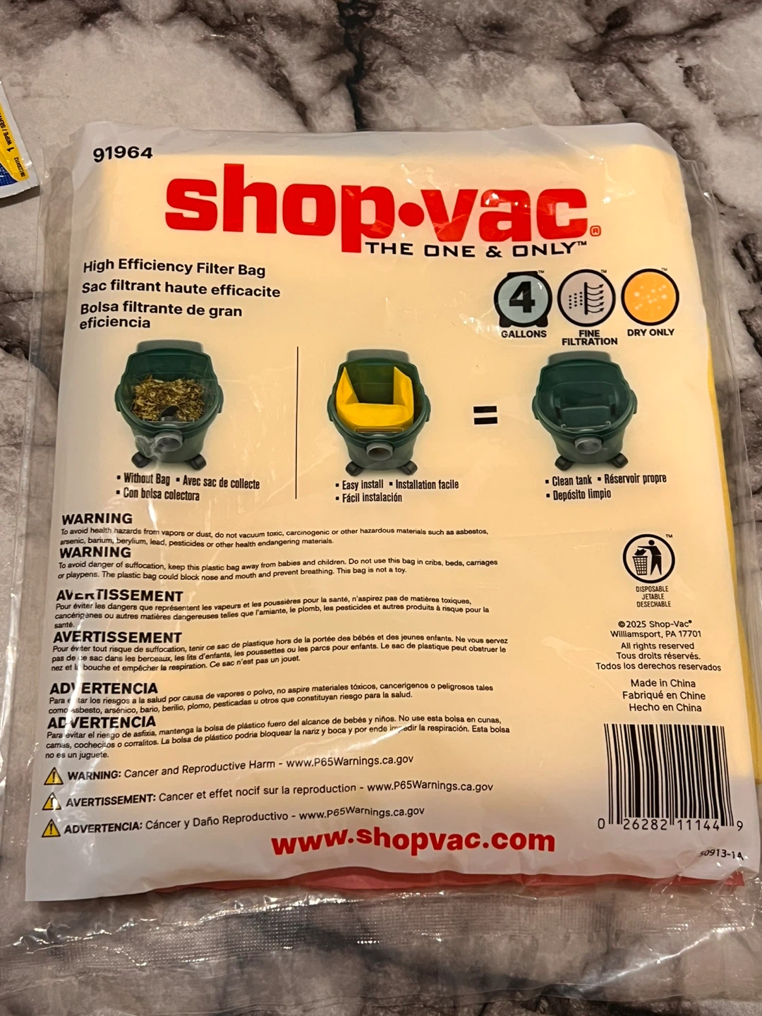 Fine filtration dry shop vacuum bag from Canadian Tire