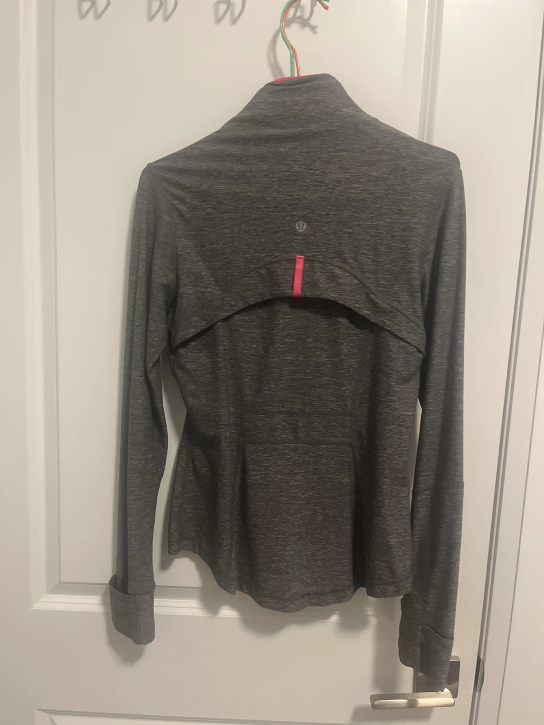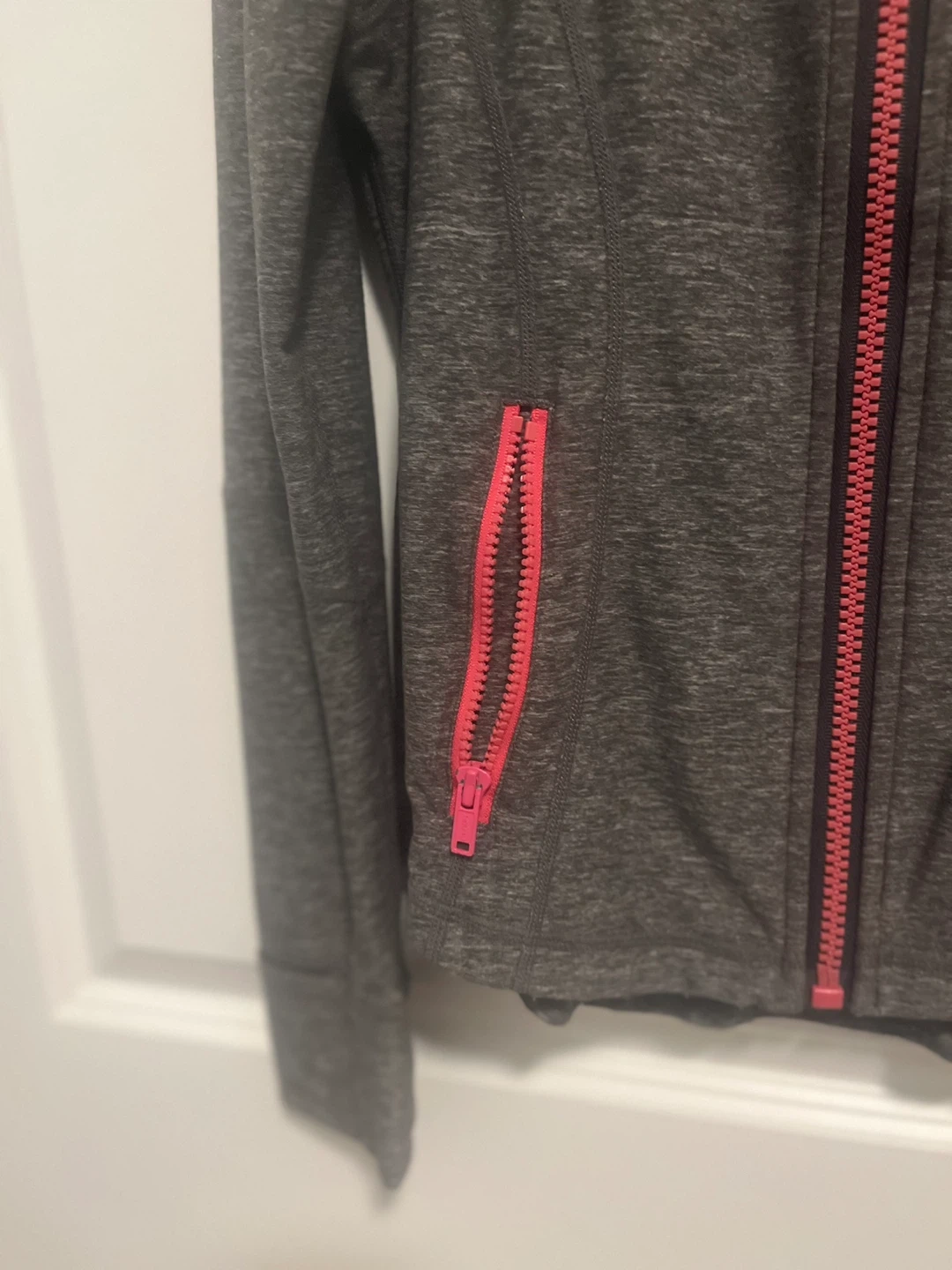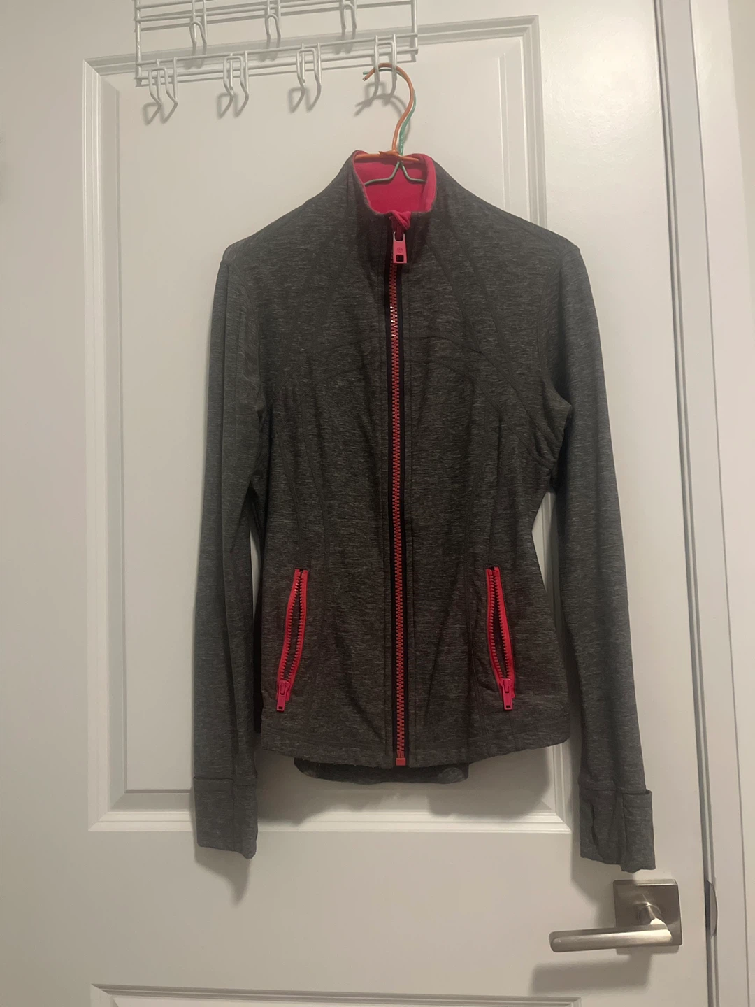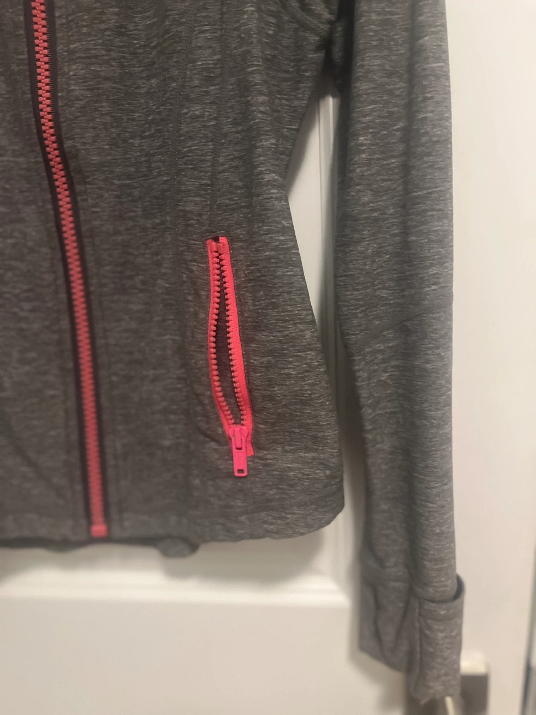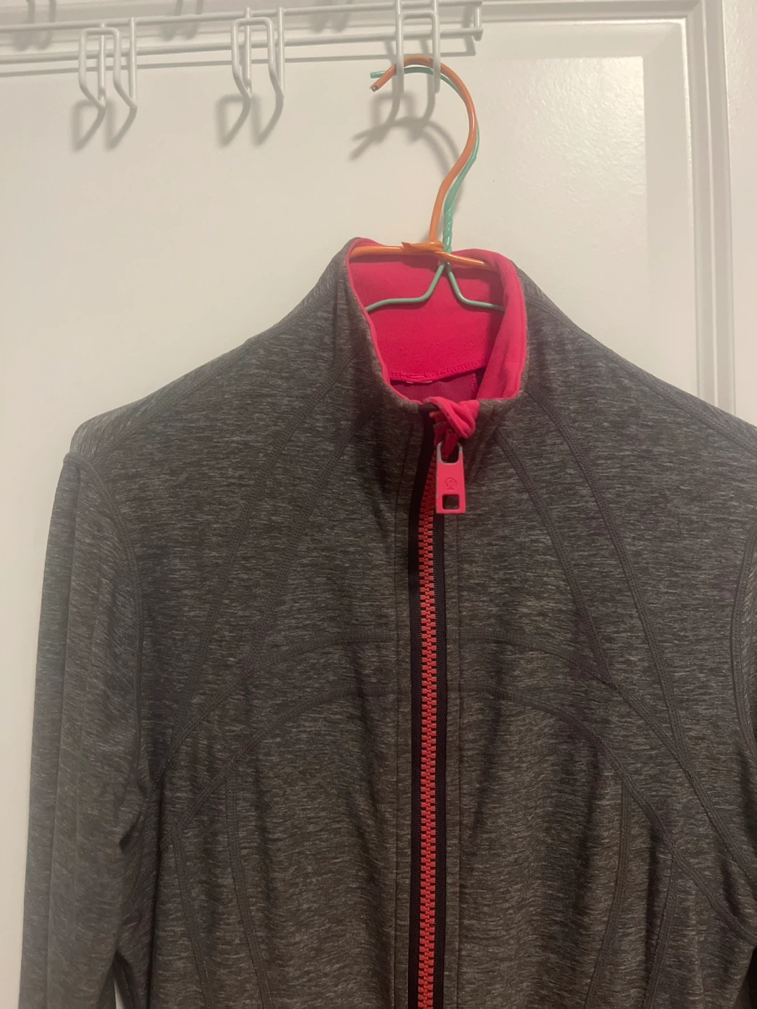 Selling a Lululemon jacket in a grey and pink colour scheme. It's in great condition and ready for a new owner. Perfect for workouts or everyday wear