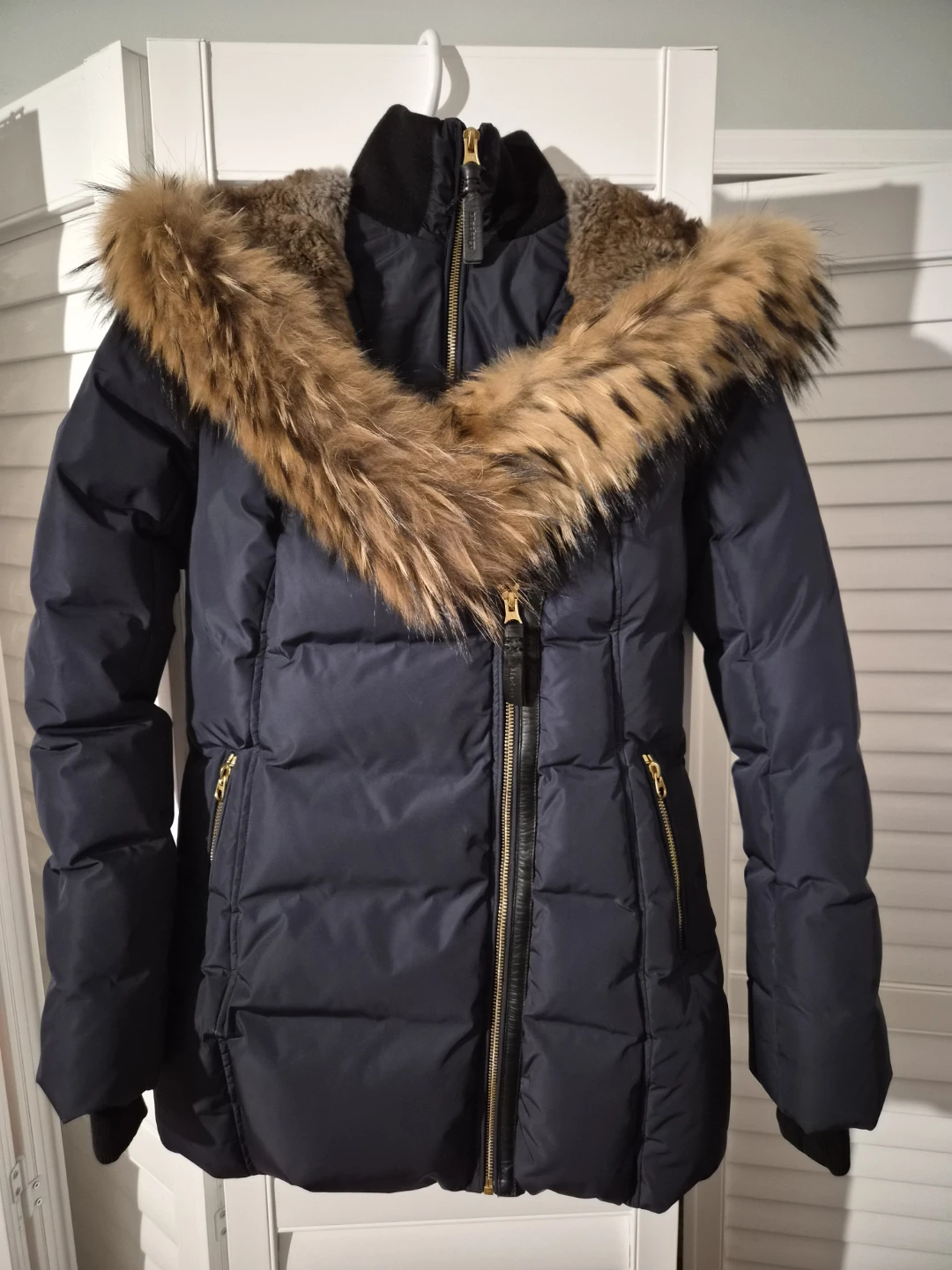 Authentic Mackage women’s short down jacket in navy, size Small.