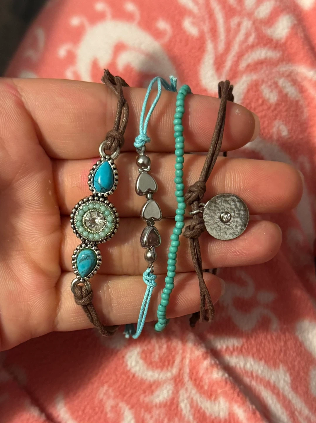 Here's a cute set of bracelets! They feature turquoise-coloured stones and silver accents. Perfect for adding a little something extra to your outfit