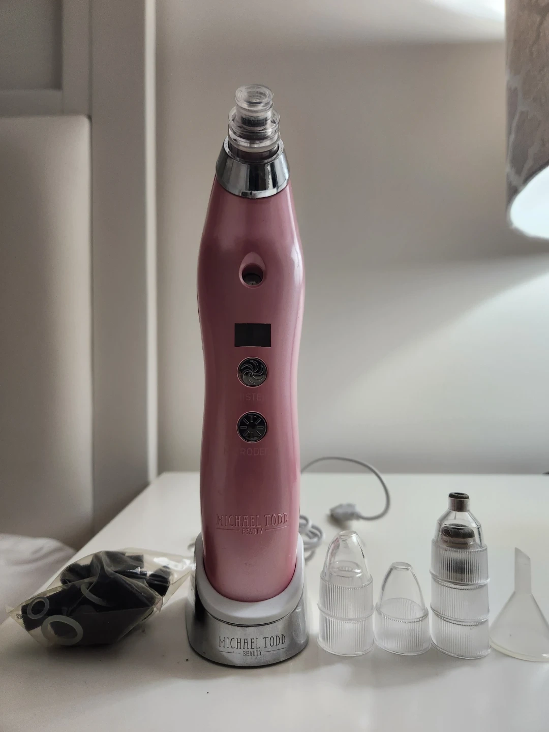 Selling a Michael Todd Beauty Sonicsmooth device. It comes with the charging base, several attachments, and a bag of black replacement heads. It's in great condition and ready for a new owner!
