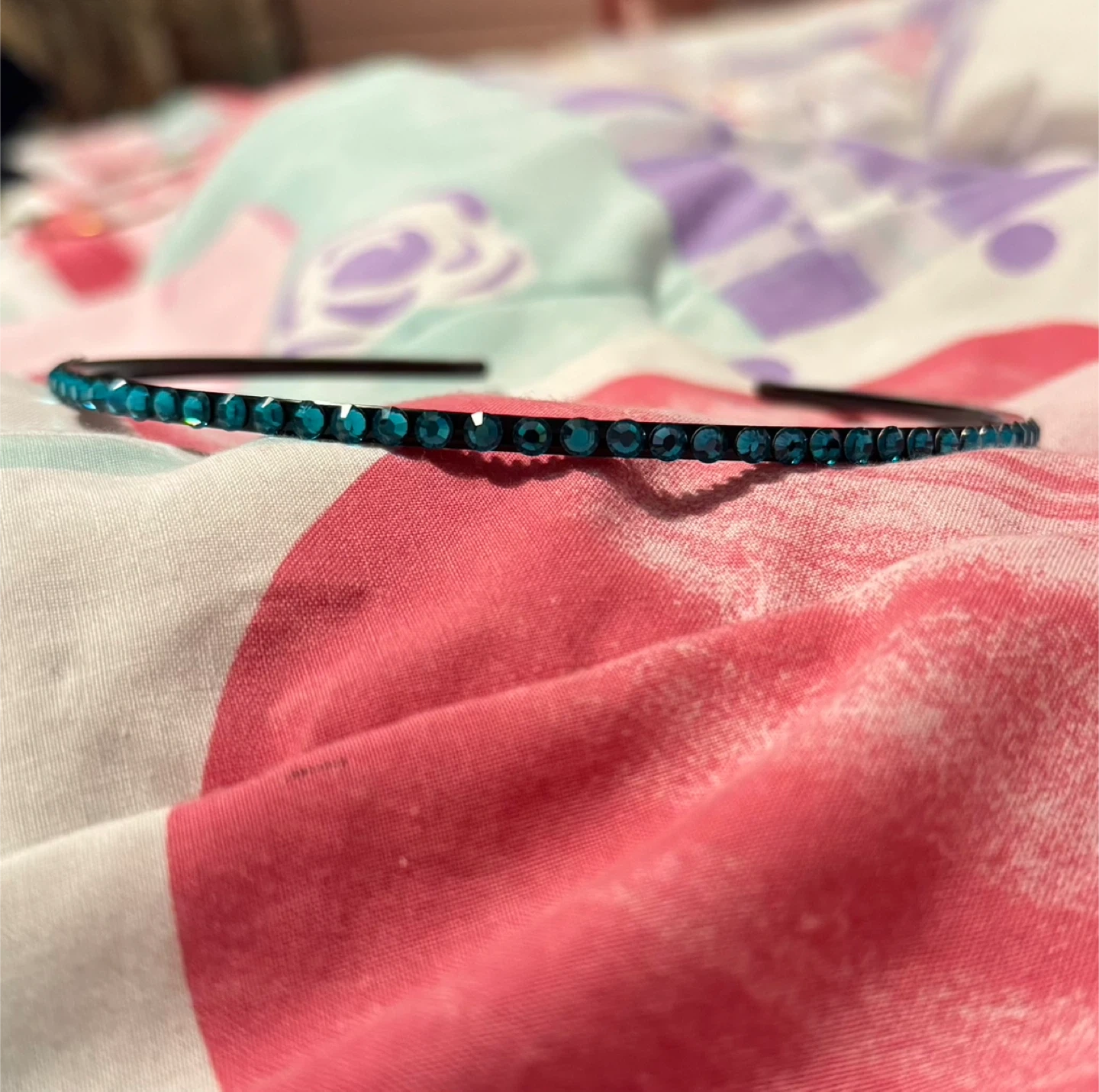 Here's a cute headband with teal rhinestones! It's in great condition and would be perfect for adding a little sparkle to any outfit