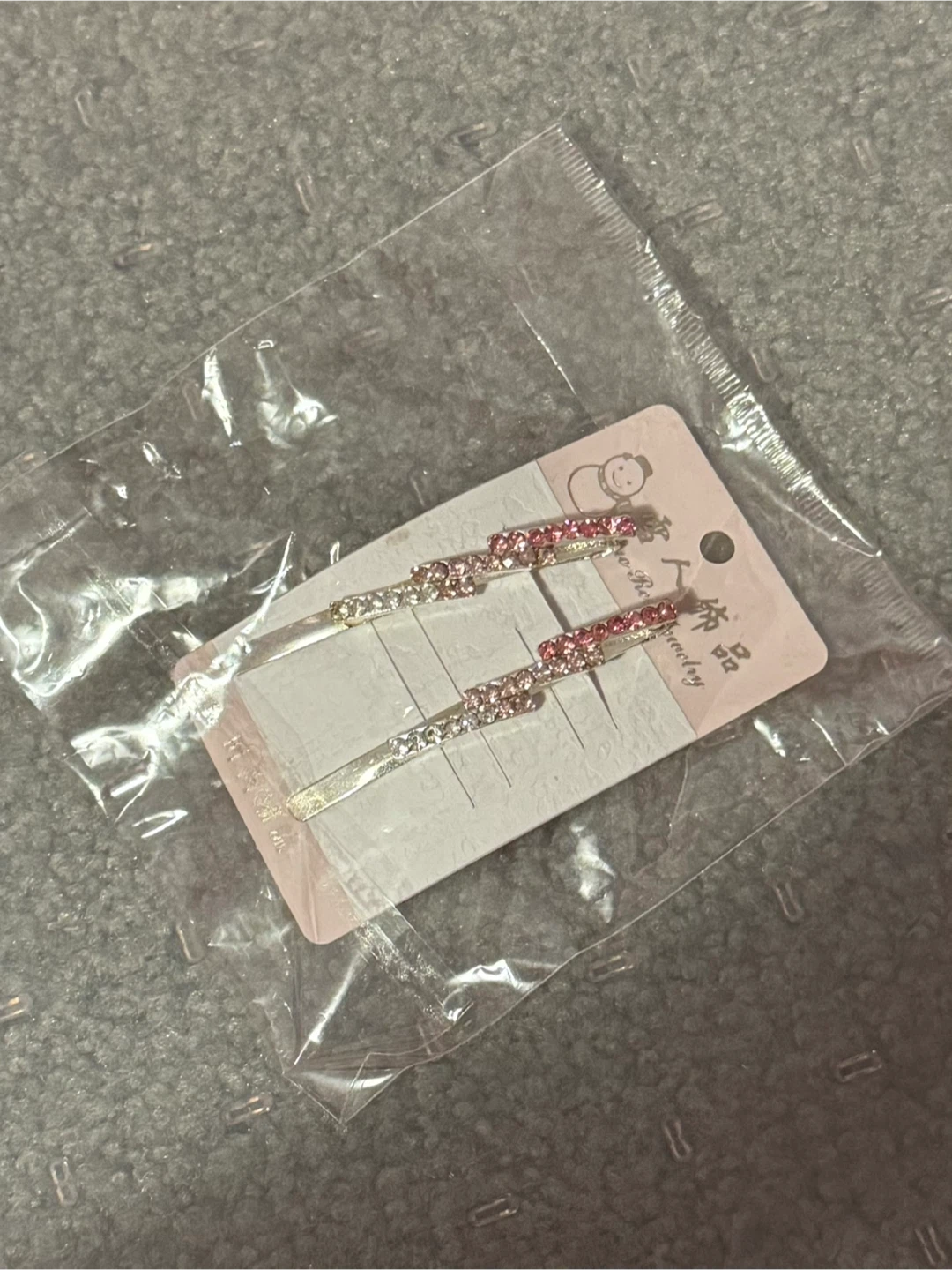 These hair clips are brand new and still in their original packaging! They feature a row of pink and clear rhinestones, adding a touch of sparkle to any hairstyle
