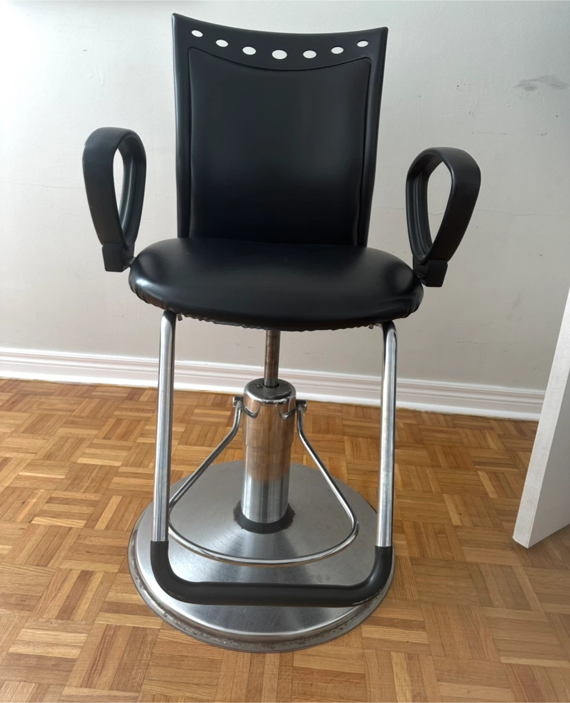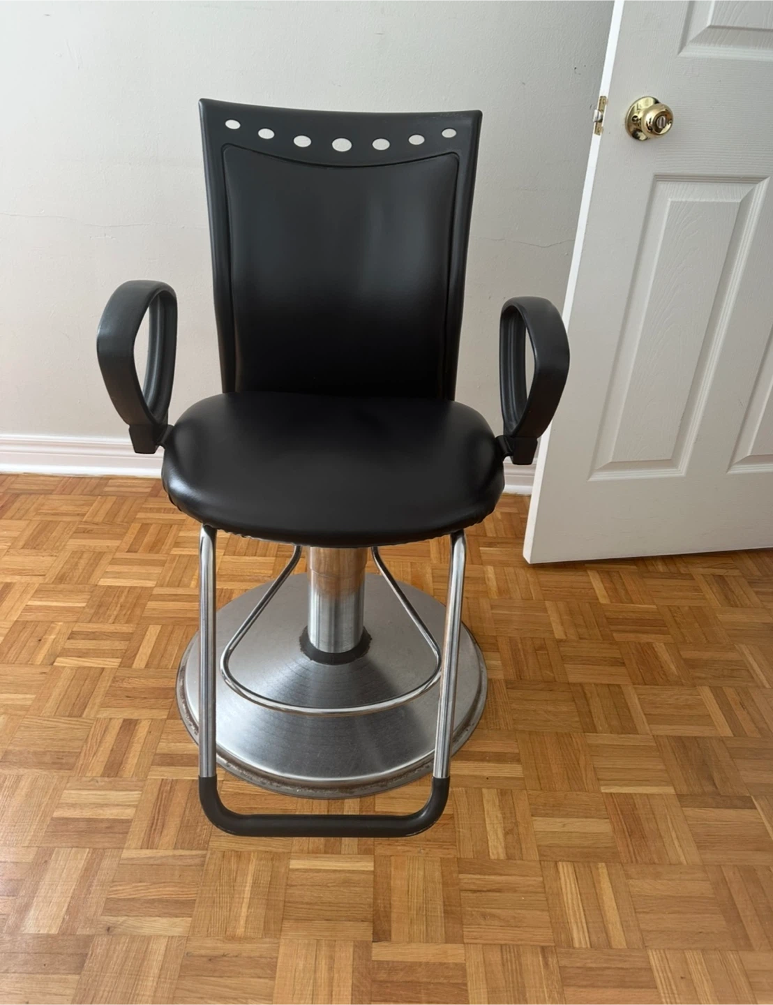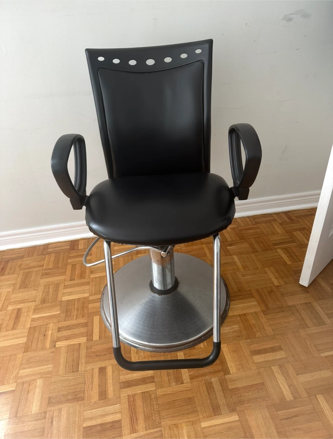 Selling a black hydraulic salon or barber chair. It has a sturdy base and comfortable seat. The chair is in used condition, it shows some signs of wear, but is still functional. Pick up only.moving out sale