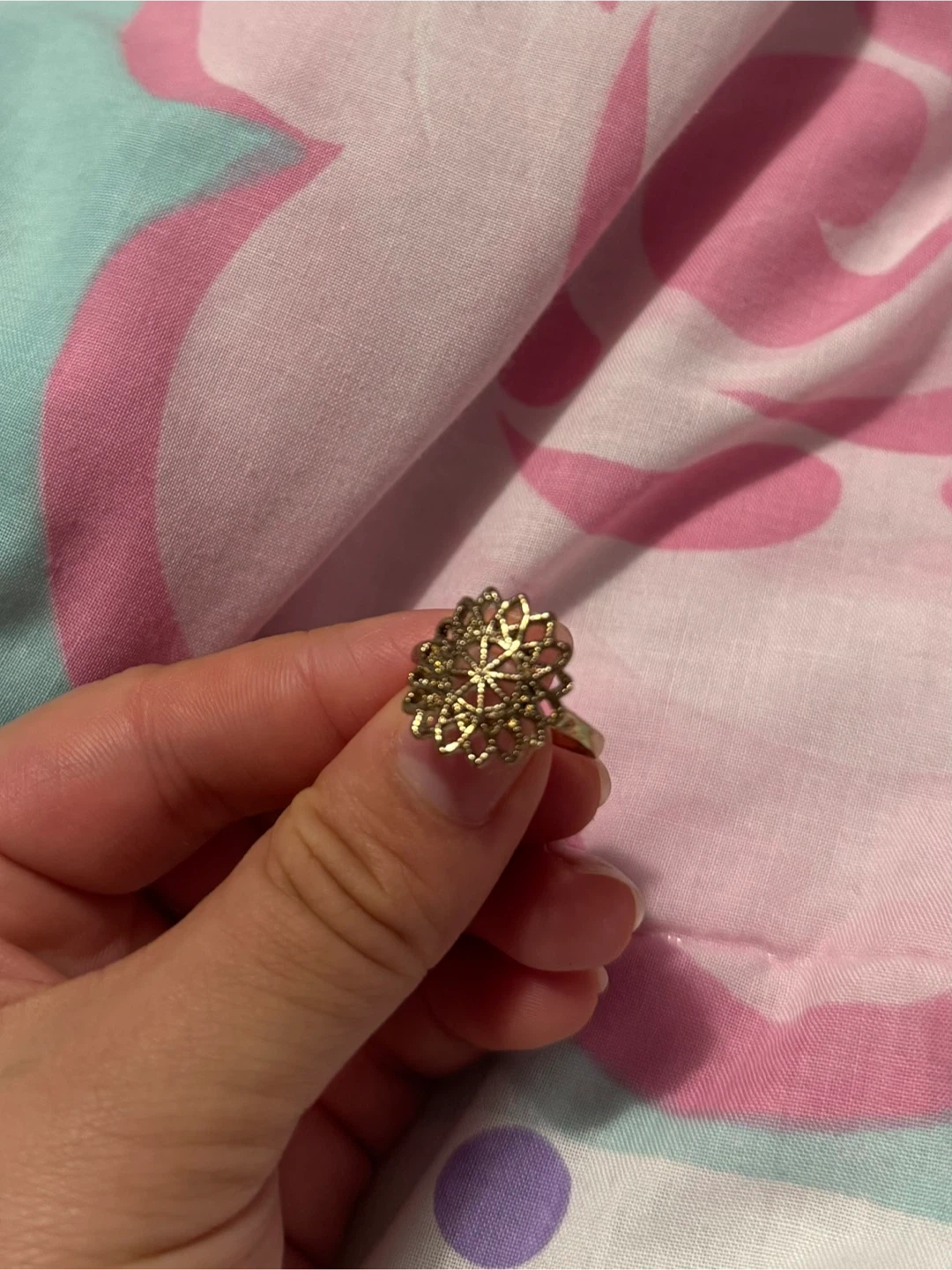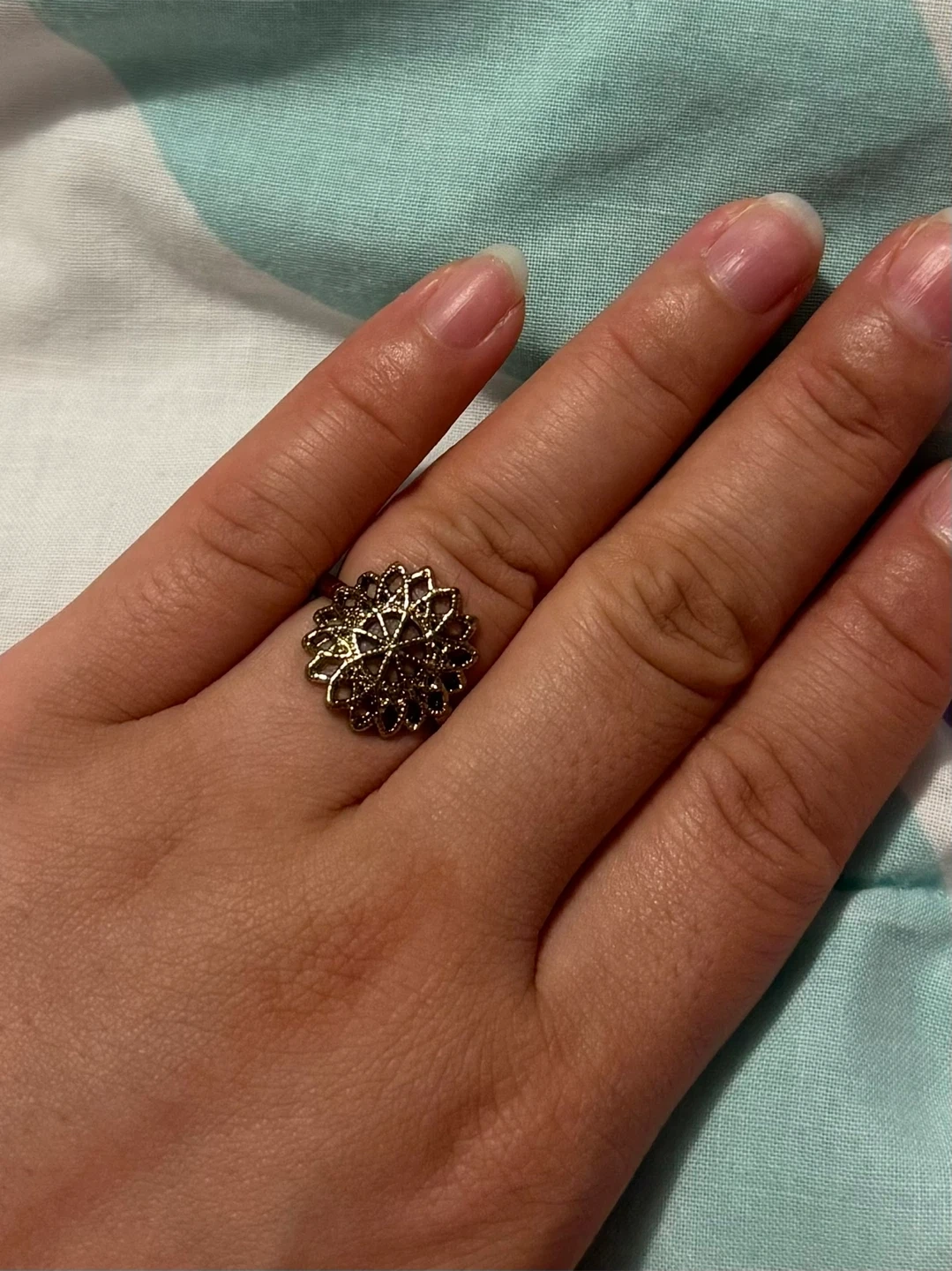 Selling a pretty gold-coloured ring with a flower design. It's in great condition and would make a lovely accessory to any outfit!