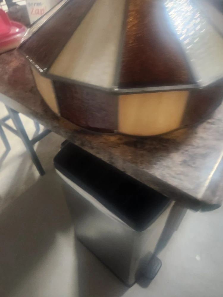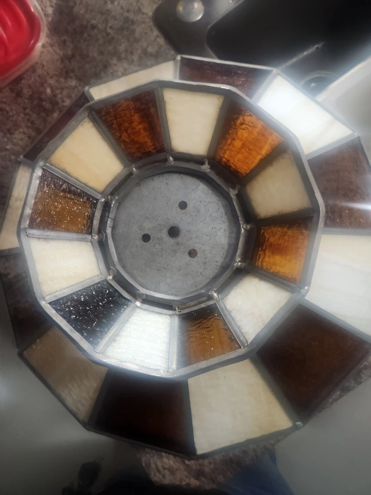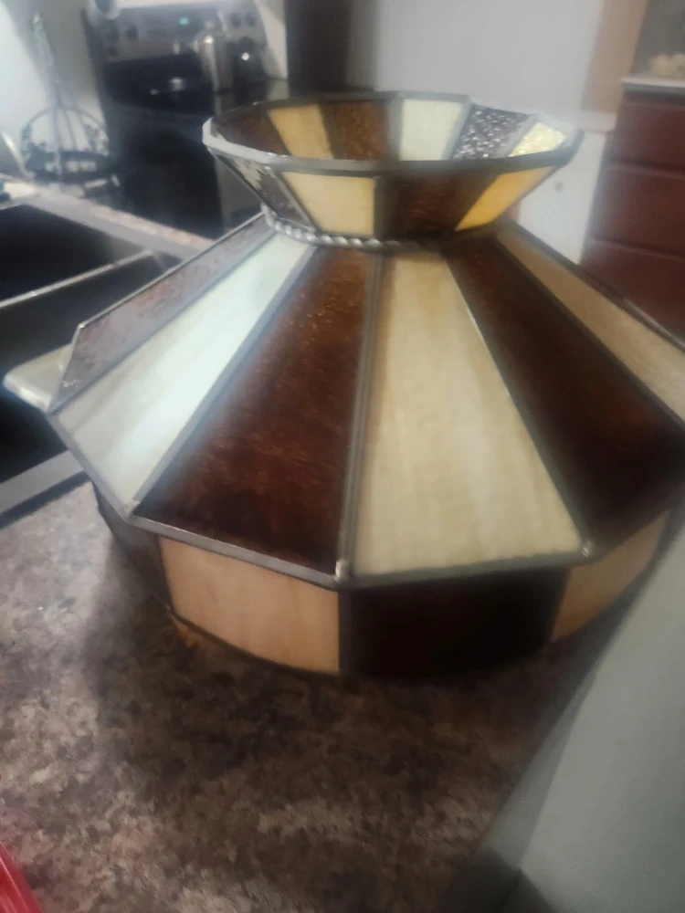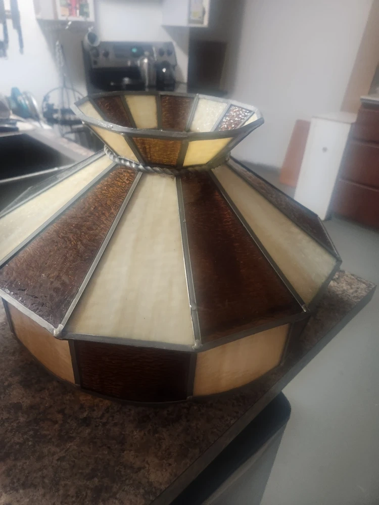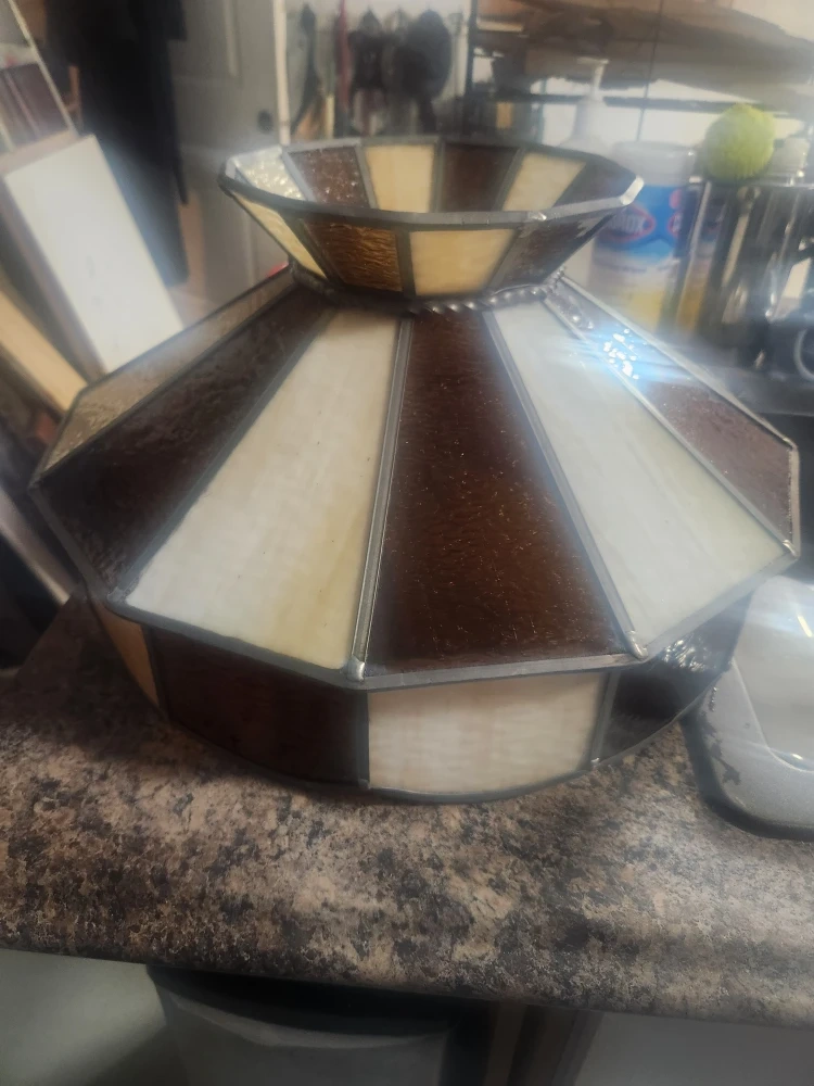 Selling a vintage stained glass lamp shade. It features a beautiful combination of brown and cream-colored glass panels. It would make a great addition to any room!